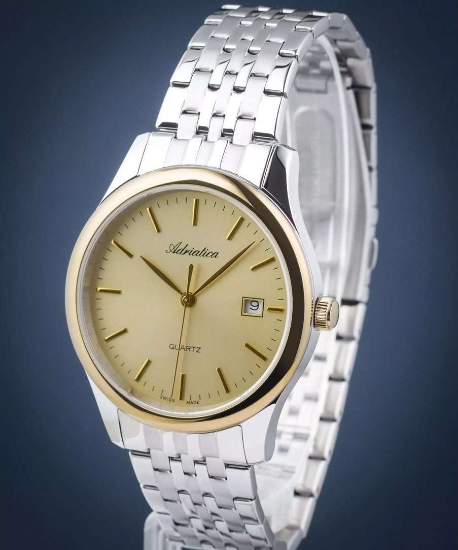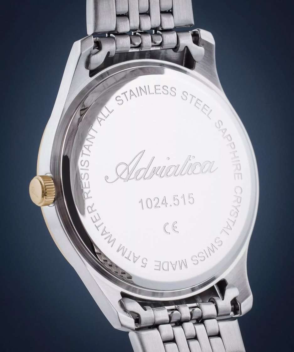 Часы Adriatica A1024.2111Q представляют собой идеальное сочетание элегантности и функциональности, разработанное для современных мужчин. Их стильный циферблат защищен сапфировым стекломСапфировое стеклоПрочный и надёжный материал из кристалла сапфира синтетического происхождения, характеризующийся особой твёрдостью и устойчивостью к царапинам и повреждениям., что придает дополнительную устойчивость к царапинам. Корпус из нержавеющей стали подчеркивает их изысканность и долговечность. Надежный кварцевый механизм с калибром RONDA 515 гарантирует точность времени, а водозащита WR 50 (5 ATM) обеспечивает защиту от воды в различных условиях. Браслет из нержавеющей стали  с раскладной застёжкойРаскладная застёжкаТакой тип застёжки используется только на браслетах из металла. Она никогда не раскрывается полностью, происходит разделение на 2 и более частей. Раскладывающая застёжка снизит вероятность потери часов к минимуму., гармонично дополняет общий дизайн и обеспечивает комфортное ношение на запястье. Часы оснащены функцией отображения даты в окошке в положении 3 часа, что добавляет практичности в повседневной жизни. БезельБезельВнешний ободок, закрепляющий стекло. В спортивных часах так называется поворотное кольцо с делениями на циферблате, выполняет роль таймера – замеряет отрезки времени на шкале. Неподвижный безель – элемент декора. Однонаправленно вращающийся безель на дайверских часах позволяет фиксировать моменты погружения и выныривания на поверхность. с PVD-покрытиемPVDУльтратонкое покрытие наносится в технике вакуумного напыления, сочетает в себе нитрид титана особой прочности со слоем золота или оксида хрома. Несёт в себе декоративную или защитную функцию..