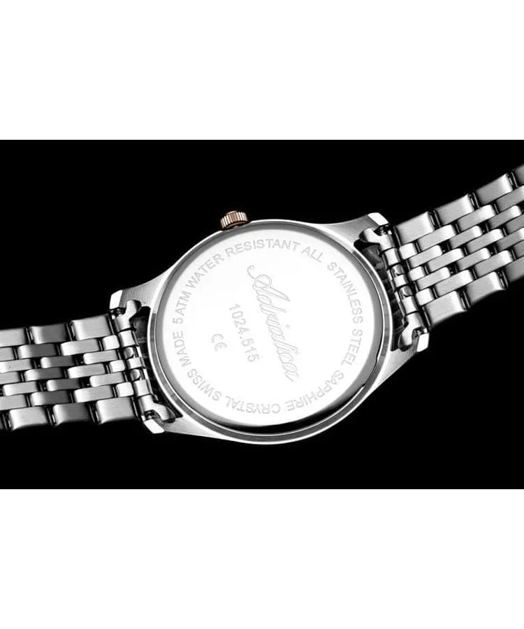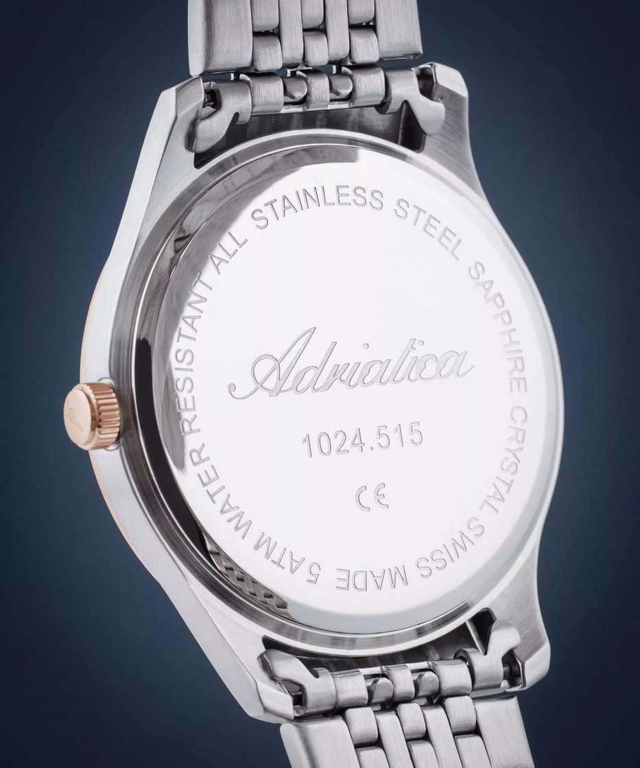 Часы Adriatica A1024.R113Q представляют собой идеальное сочетание элегантности и функциональности, разработанное для современных мужчин. Их стильный циферблат защищен сапфировым стекломСапфировое стеклоПрочный и надёжный материал из кристалла сапфира синтетического происхождения, характеризующийся особой твёрдостью и устойчивостью к царапинам и повреждениям., что придает дополнительную устойчивость к царапинам. Корпус из нержавеющей стали подчеркивает их изысканность и долговечность. Надежный кварцевый механизм с калибром RONDA 515 гарантирует точность времени, а водозащита WR 50 (5 ATM) обеспечивает защиту от воды в различных условиях. Браслет из нержавеющей стали  с раскладной застёжкойРаскладная застёжкаТакой тип застёжки используется только на браслетах из металла. Она никогда не раскрывается полностью, происходит разделение на 2 и более частей. Раскладывающая застёжка снизит вероятность потери часов к минимуму., гармонично дополняет общий дизайн и обеспечивает комфортное ношение на запястье. Часы оснащены функцией отображения даты в окошке в положении 3 часа, что добавляет практичности в повседневной жизни. БезельБезельВнешний ободок, закрепляющий стекло. В спортивных часах так называется поворотное кольцо с делениями на циферблате, выполняет роль таймера – замеряет отрезки времени на шкале. Неподвижный безель – элемент декора. Однонаправленно вращающийся безель на дайверских часах позволяет фиксировать моменты погружения и выныривания на поверхность. с PVD-покрытиемPVDУльтратонкое покрытие наносится в технике вакуумного напыления, сочетает в себе нитрид титана особой прочности со слоем золота или оксида хрома. Несёт в себе декоративную или защитную функцию..