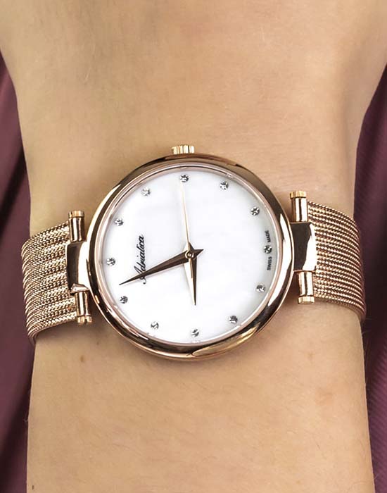 Женские часы с минеральным стеклом Adriatica A3689.914FQ, кварцевый механизм с высокой точностью. Класс водозащиты: 30 метров, позволит защитить корпус от случайных брызг или капель дождя. Корпус часов изготовлен из стали, золотистого цвета.