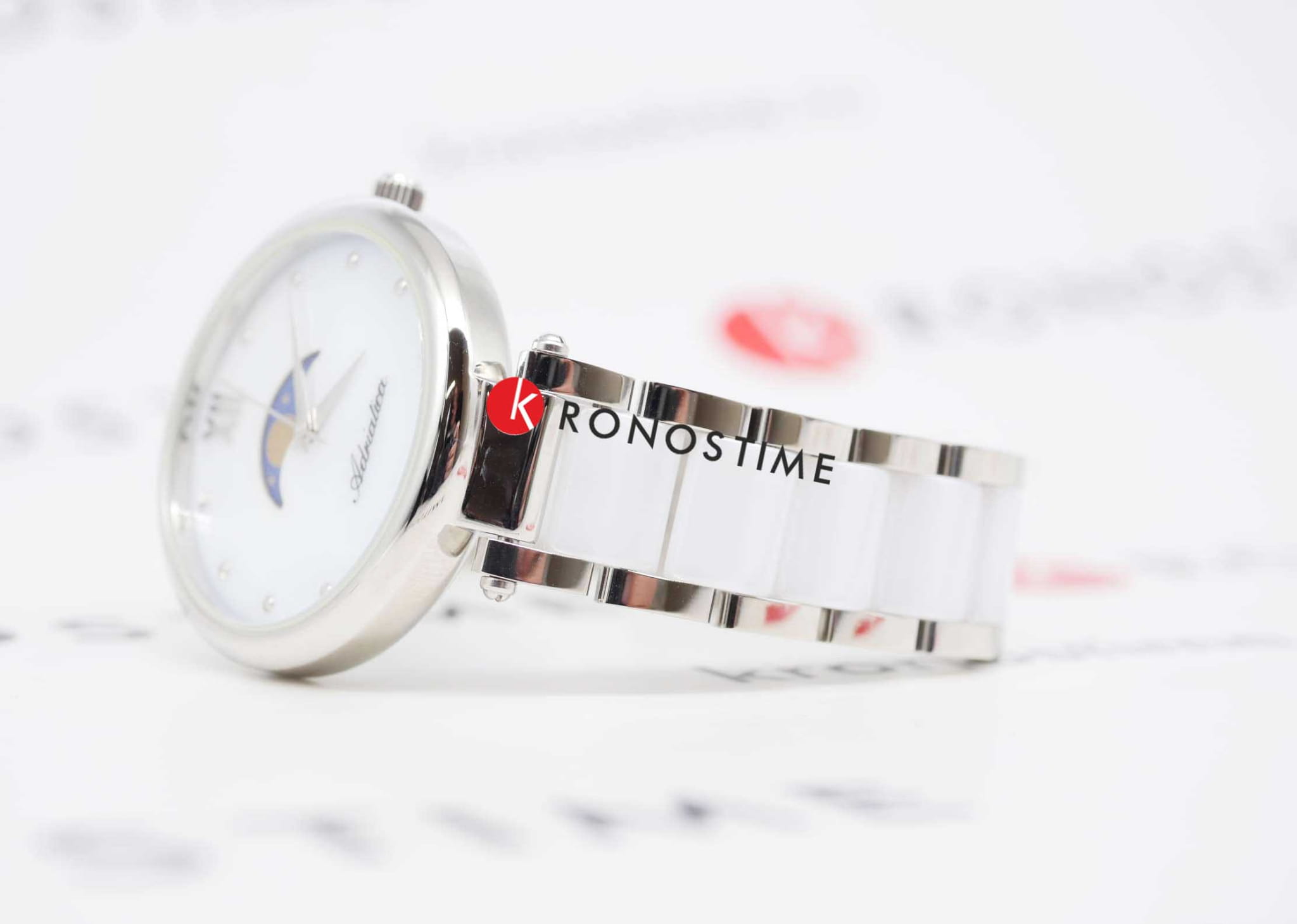 Женские часы Adriatica A3705.C18FQM представляют собой гармонию изысканности и функциональности, создавая идеальный аксессуар для тех, кто ценит качество и стиль. Эти швейцарские часы оснащены надежным кварцевым механизмом с калибром Ronda 788, который гарантирует точность и долговечность. Корпус, выполненный из нержавеющей стали, имеет диаметр 34 мм и толщину 7 мм, что придаёт ему утончённый и современный вид. Перламутровый белый циферблат, защищённый минеральным стекломМинеральное стеклоМинеральное стекло представляет собой искусственно выращенный минерал кварца. Такое стекло отличается особой устойчивостью к повреждениям и царапинам. Уступает по некоторым качествам сапфировому стеклу., добавляет элегантности и привлекает внимание. Особое внимание заслуживает браслет из нержавеющей стали с белыми биокерамическимиБиокерамикаБиокерамика — это материал, который на две трети состоит из керамики, на одну треть — из биопластика. Он сочетает в себе лучшие качества обоих материалов и обладает прочностью и шелковистой на ощупь текстурой. вставками, который обеспечивает комфорт и надёжность при носке, а ювелирная застёжка добавляет дополнительный акцент на изысканность. Функция отображения фазы луны придаёт часам уникальность и делает их не только стильным, но и функциональным аксессуаром. Водозащита уровня 50WR позволяет не беспокоиться о воздействии влаги, что увеличивает практичность часов в повседневной жизни. Часы Adriatica A3705.C18FQM — это символ швейцарского качества, сочетающий в себе современные технологии и классический дизайн.