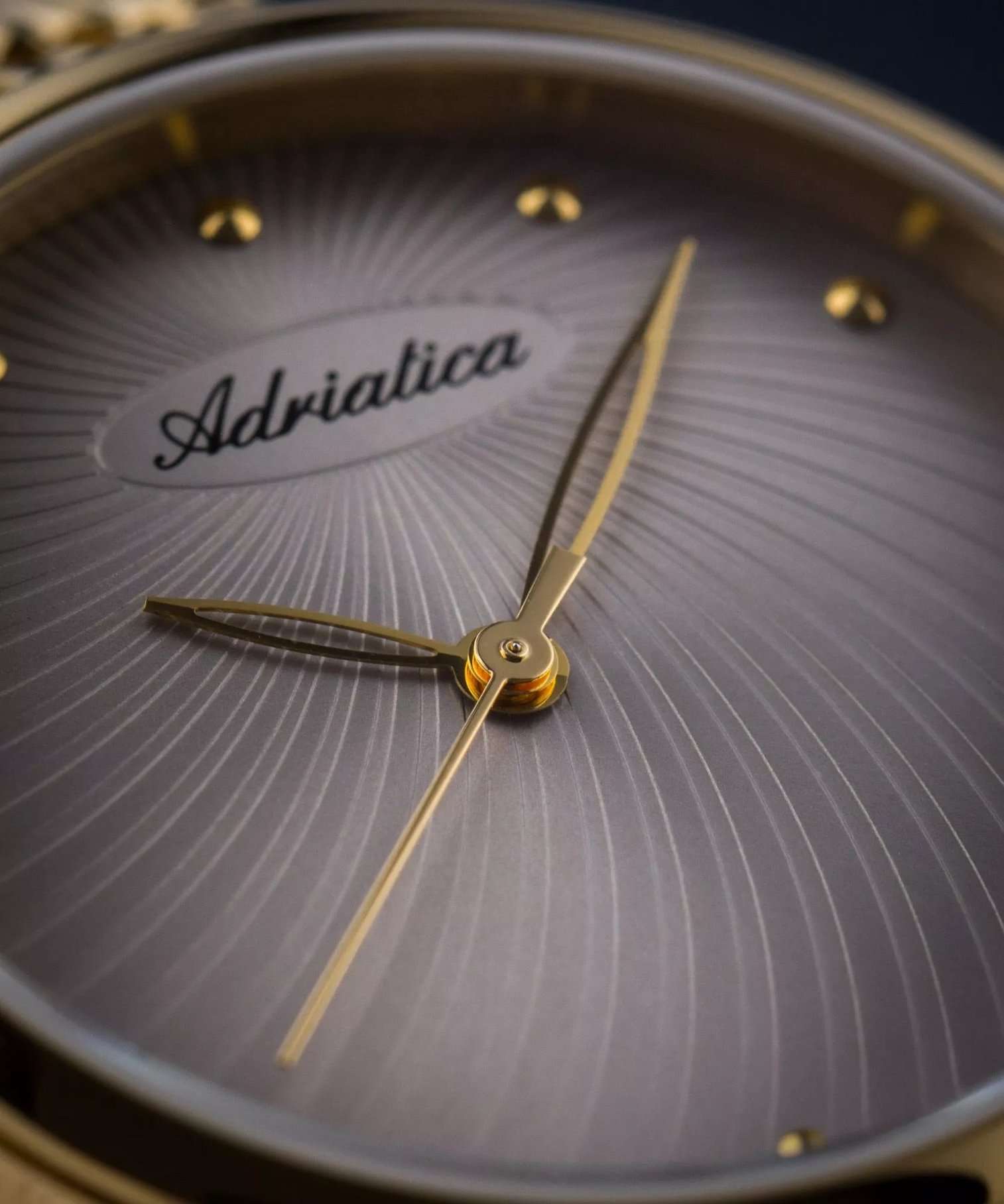 Изысканные женские часы Adriatica A3822.1147Q, произведенные в Швейцарии. Эти часы идеально подойдут для женщин, ценящих элегантность и стиль. Часы оснащены надежным кварцевым механизмом Ronda 763, обеспечивающим точность и долговечность. Корпус диаметром 30 мм и толщиной 7 мм выполнен из стали с PVDPVDУльтратонкое покрытие наносится в технике вакуумного напыления, сочетает в себе нитрид титана особой прочности со слоем золота или оксида хрома. Несёт в себе декоративную или защитную функцию. покрытием, что придает часам современный и утонченный вид. Серый циферблат, украшенный точками, придает дополнительную изысканность. Минеральное стеклоМинеральное стеклоМинеральное стекло представляет собой искусственно выращенный минерал кварца. Такое стекло отличается особой устойчивостью к повреждениям и царапинам. Уступает по некоторым качествам сапфировому стеклу. защищает циферблат от повреждений, а водозащита уровня 30WR позволяет использовать часы в условиях легкой влажности. Стальной браслет с PVDPVDУльтратонкое покрытие наносится в технике вакуумного напыления, сочетает в себе нитрид титана особой прочности со слоем золота или оксида хрома. Несёт в себе декоративную или защитную функцию. покрытием золотистого цвета с ювелирной застежкой обеспечивает комфортное ношение и надежную фиксацию на запястье.