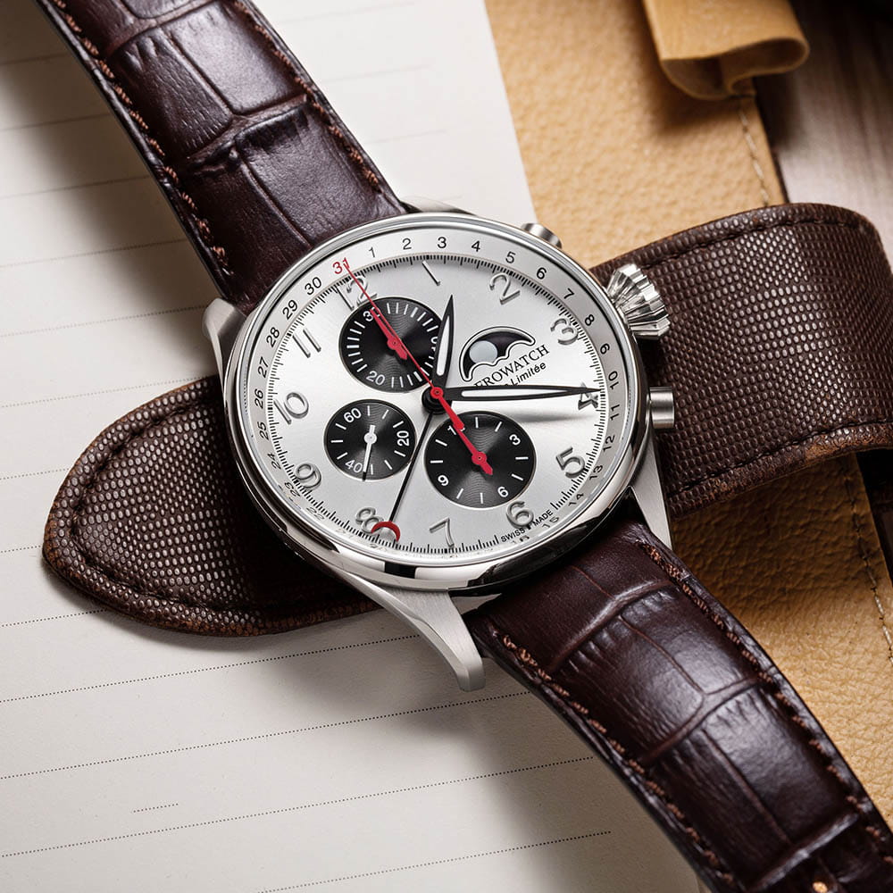 Мужские механические швейцарские часы-хронографХронографФункция позволяет измерять отрезки времени с особой точностью: часы, минуты, секунды. Верным признаком хронографа является наличие на циферблате 3 дополнительных окошек-счётчиков. с автоподзаводом AerowatchLes Grandes Classiques Chrono Moon Phase Limited Edition 69989 AA04. Лимитированное издание 199 экземпляров. Сапфировое стеклоСапфировое стеклоПрочный и надёжный материал из кристалла сапфира синтетического происхождения, характеризующийся особой твёрдостью и устойчивостью к царапинам и повреждениям. устойчивое к появлению царапин, обладающее высокой прозрачностью. Корпус изготовлен из нержавеющей стали. В часах установлен калибр Valjoux 7750 с 25ю камнями. Циферблат украшают стрелки и метки с люминесцентным покрытиемЛюминесцентное покрытиеПозволяет считывать показания времени в темноте. Производители наносят на стрелки, часовые индексы, безель или поверхность циферблата светонакопительный состав, дающий холодное свечение.. На циферблате 3 счетчика, индикация фаз луны на 3 часах, дата по стрелке. Регулировка фазы луны и даты происходит с помощью заводной головки. Класс водозащиты: 50 метров, позволит защитить корпус от случайных брызг или капель дождя. Кожаный ремешок на стандартной застёжке.