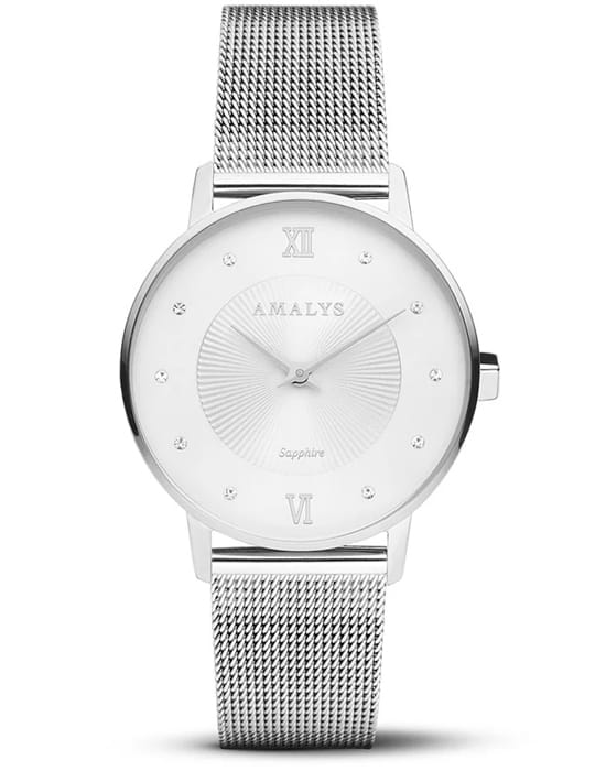 Amalys AMW-180 — женская модель с утончённым классическим дизайном, в которой сочетаются элегантность и практичность. Круглый корпус диаметром 33 мм выполнен из нержавеющей стали, гармонирующим с браслетом шириной 16 мм в том же исполнении. Защитную функцию выполняет сапфировое стеклоСапфировое стеклоПрочный и надёжный материал из кристалла сапфира синтетического происхождения, характеризующийся особой твёрдостью и устойчивостью к царапинам и повреждениям., стойкое к царапинам и сохраняющее прозрачность. Механизм — кварцевый, обеспечивающий точность и стабильность хода. Браслет миланского плетения снабжён раскладным замкомРаскладной замокДанный вариант застежки используется только на часах с металлическим браслетом. Отличительная особенность такого крепления в том, что длина браслета становится универсальной и вы можете самостоятельно отрегулировать нужный вам размер – застежка просто двигается по браслету часов., который сочетает надёжность фиксации и удобство повседневного использования. Водозащита 3 ATM защищает часы от случайных брызг и дождя. Циферблат с римскими индексами и изящными стрелками подчёркивает классическую эстетику модели, делая её уместной как в повседневных образах, так и в торжественной обстановке.