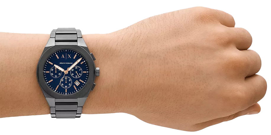 Мужские наручные часы-хронографХронографФункция позволяет измерять отрезки времени с особой точностью: часы, минуты, секунды. Верным признаком хронографа является наличие на циферблате 3 дополнительных окошек-счётчиков. Armani Exchange Rafael AX4182 сочетают в себе практичность и стильный дизайн, идеально подходя как для повседневной носки, так и для занятий спортом. Часы оснащены круглым корпусом из нержавеющей стали с IP-покрытиемIP-покрытиеМетод ионного напыления. Демонстрирует повышенную устойчивость к истиранию, окислению и химическим веществам. Под воздействием высокого давления и температуры около 1500°C молекулы металла надёжно соединяются с частицами корпуса часов. серого цвета, диаметром 42 мм. Особенностью модели является наличие окошка даты, расположенного между отметками 4 и 5 часов, что добавляет функциональности аксессуару. Стрелки обладают люминесцентным покрытиемЛюминесцентное покрытиеПозволяет считывать показания времени в темноте. Производители наносят на стрелки, часовые индексы, безель или поверхность циферблата светонакопительный состав, дающий холодное свечение., которое светится в темноте после зарядки на свету, обеспечивая отличную видимость в любых условиях. Защиту циферблата обеспечивают минеральное стеклоМинеральное стеклоМинеральное стекло представляет собой искусственно выращенный минерал кварца. Такое стекло отличается особой устойчивостью к повреждениям и царапинам. Уступает по некоторым качествам сапфировому стеклу., которое устойчиво к царапинам и сохраняет прозрачность на протяжении всего срока службы. Стальной браслет на раскладной застёжкеРаскладная застёжкаТакой тип застёжки используется только на браслетах из металла. Она никогда не раскрывается полностью, происходит разделение на 2 и более частей. Раскладывающая застёжка снизит вероятность потери часов к минимуму. не только комфортен в ношении, но и практичен благодаря своей прочности. Модель обладает водозащитой до 50 метров, что позволит защитить корпус от случайных брызг или капель дождя.