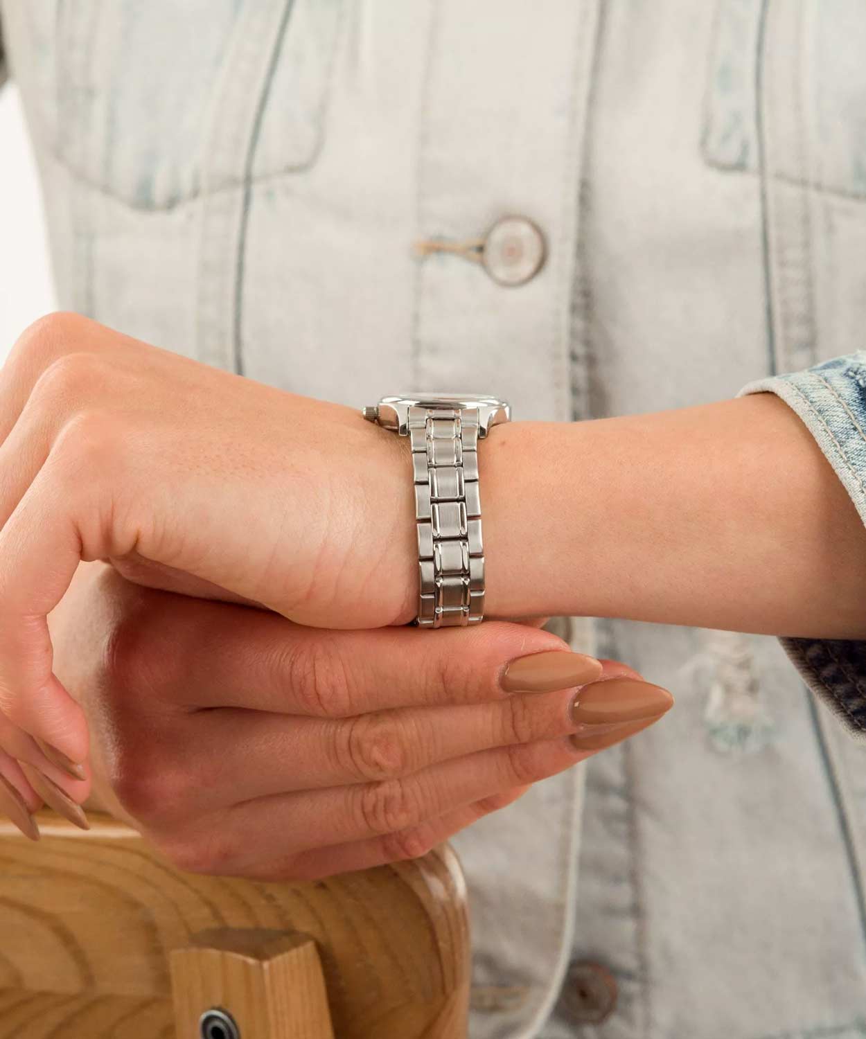 Женские швейцарские часы Atlantic Seapair Ladies 20348.41.21, кварцевый механизм с высокой точностью. Циферблат часов с люминесцентным покрытиемЛюминесцентное покрытиеПозволяет считывать показания времени в темноте. Производители наносят на стрелки, часовые индексы, безель или поверхность циферблата светонакопительный состав, дающий холодное свечение. стрелок и меток, дополнен сапфировым стекломСапфировое стеклоПрочный и надёжный материал из кристалла сапфира синтетического происхождения, характеризующийся особой твёрдостью и устойчивостью к царапинам и повреждениям., устойчивым к появлению царапин и обладающее высокой прозрачностью. Класс водозащиты: 30 метров, позволит защитить корпус от случайных брызг или капель дождя. Корпус часов изготовлен из нержавеющей стали. Стальной браслет с раскладной застёжкойРаскладная застёжкаТакой тип застёжки используется только на браслетах из металла. Она никогда не раскрывается полностью, происходит разделение на 2 и более частей. Раскладывающая застёжка снизит вероятность потери часов к минимуму.. Окошко даты находится в положении 3 часа.