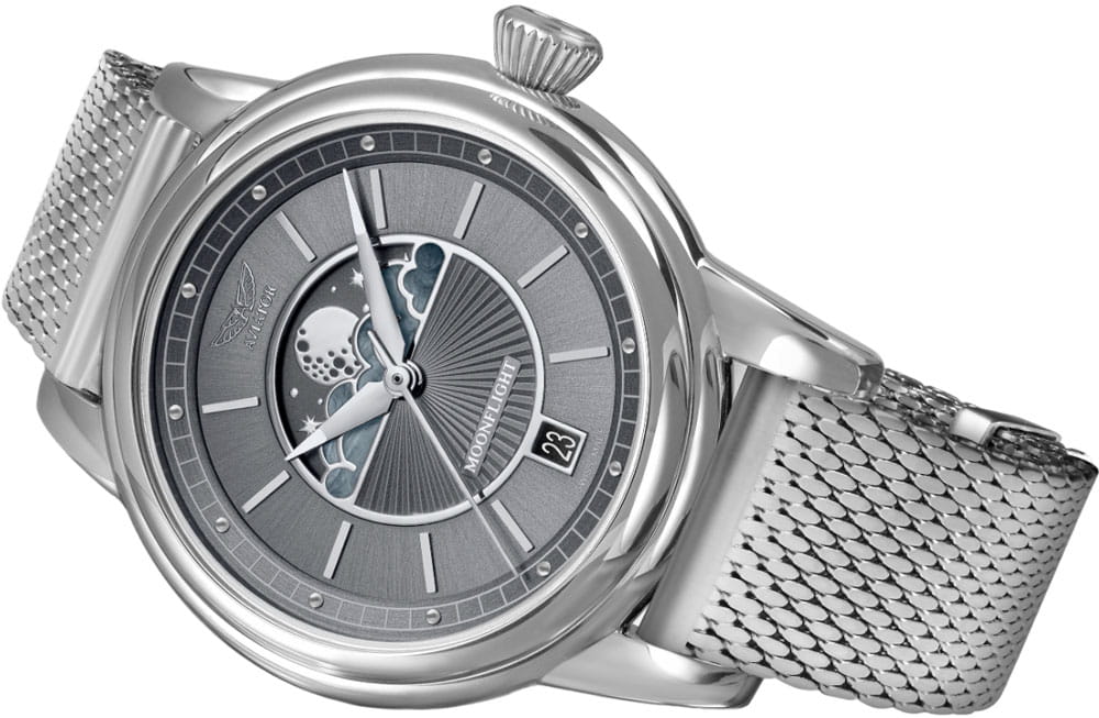 Aviator Douglas MoonFlight V.1.33.0.254.5 — элегантный дамский швейцарский Moonphase-хронограф с утончённой авиационной эстетикой. Корпус 36 мм из нержавеющей стали 316L обладает компактными пропорциями и удобным литым профилем. Циферблат в стиле Art Deco украшает усложнение фаз Луны в верхней половине, обрамлённой тонким кольцом облаков. Отмечено окно даты в положении «6 часов». Стрелки обработаны люминесцентным покрытиемЛюминесцентное покрытиеПозволяет считывать показания времени в темноте. Производители наносят на стрелки, часовые индексы, безель или поверхность циферблата светонакопительный состав, дающий холодное свечение. Superluminova — для уверенного считывания в темноте. Поверхность защищена сапфировым стекломСапфировое стеклоПрочный и надёжный материал из кристалла сапфира синтетического происхождения, характеризующийся особой твёрдостью и устойчивостью к царапинам и повреждениям. с антибликовым покрытиемАнтибликовое покрытиеСлой оксида металла в 0,13-0,3 микрон, благодаря которому стекло часов не бликует и не отражает свет. Антибликовое покрытие уменьшает отражение света в 10 раз, обеспечивая отличную читаемость показателей циферблата.. Сердце модели — швейцарский кварцевый механизм Ronda 708 с функцией отображения лунных фаз, 13 рубинами и возможностью работать до 54 месяцев без замены батареи. Завинчивающаяся задняя крышка с гравировкой Douglas DC-3 и герметичность до 100 метров создают надёжную основу для эксплуатации. Стальной браслет миланского плетения на раскладном замкеРаскладной замокДанный вариант застежки используется только на часах с металлическим браслетом. Отличительная особенность такого крепления в том, что длина браслета становится универсальной и вы можете самостоятельно отрегулировать нужный вам размер – застежка просто двигается по браслету часов., сочетая комфорт, элегантность и практичность. Лимитированная серия. Aviator Douglas MoonFlight — это гармоничное сочетание авиационного наследия, женской элегантности и технической изысканности, воплощённое в элегантном и функциональном аксессуаре.