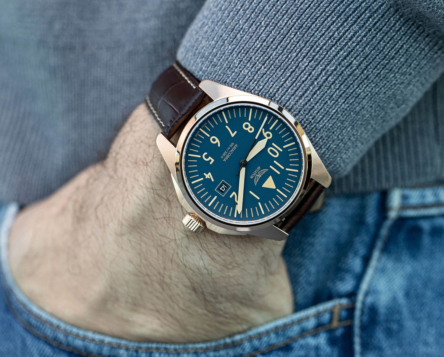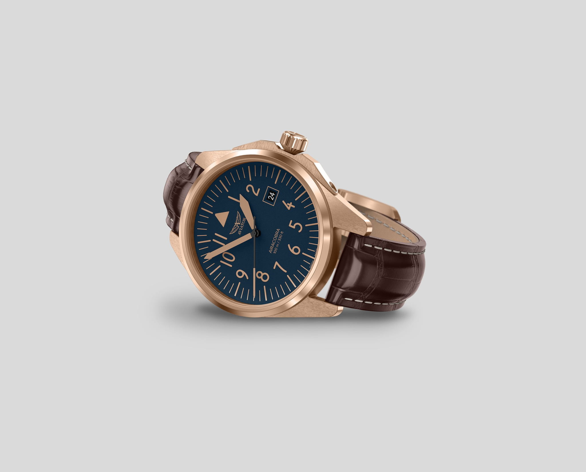 Aviator Airacobra 43 Type A V.1.38.2.318.4 — надёжные швейцарские пилотские часы с насыщенным функционалом и строгим авиационным дизайном. Корпус диаметром 42,8 мм выполнен из нержавеющей стали 316L с PVD-покрытиемPVDУльтратонкое покрытие наносится в технике вакуумного напыления, сочетает в себе нитрид титана особой прочности со слоем золота или оксида хрома. Несёт в себе декоративную или защитную функцию.. Циферблат имеет крупные арабские цифры и жёсткий контраст, соответствующий классическим пилотским образцам. Стрелки и метки покрыты люминесцентным покрытиемЛюминесцентное покрытиеПозволяет считывать показания времени в темноте. Производители наносят на стрелки, часовые индексы, безель или поверхность циферблата светонакопительный состав, дающий холодное свечение. Superluminova — это обеспечивает отличную читаемость в любых условиях. Окошко даты расположено у отметки «3 часа». На борту установлен швейцарский кварцевый механизм, способный с высокой точностью отображать время, дату. Циферблат защищён стойким сапфировым стекломСапфировое стеклоПрочный и надёжный материал из кристалла сапфира синтетического происхождения, характеризующийся особой твёрдостью и устойчивостью к царапинам и повреждениям. с антибликовым покрытиемАнтибликовое покрытиеСлой оксида металла в 0,13-0,3 микрон, благодаря которому стекло часов не бликует и не отражает свет. Антибликовое покрытие уменьшает отражение света в 10 раз, обеспечивая отличную читаемость показателей циферблата., завинчивающаяся заводная головка и задняя крышка обеспечивают уровень водозащиты до 100 метров. Кожаный ремень со стандартной застежкой обеспечивает удобство и надёжную фиксацию. Airacobra 43 Type A — инструментальные пилотские часы для тех, кто ценит надёжность, точность и удобную функциональность второго часового пояса в эстетике классических авиационных хронометров. Лимитированная серия.