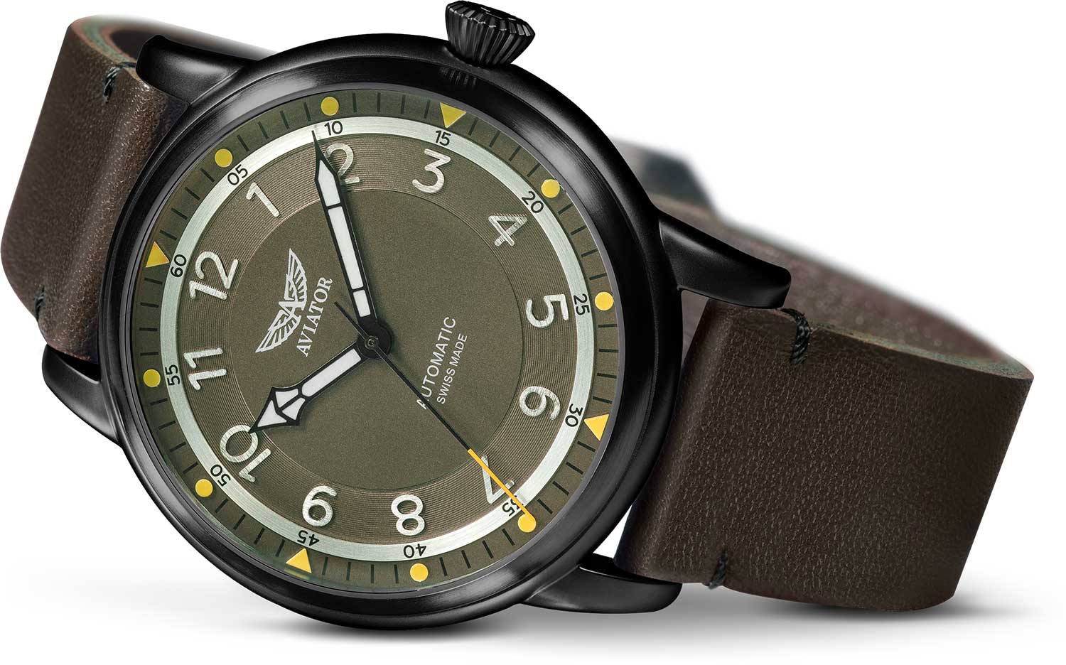 Aviator Douglas V.3.31.5.227.4 — швейцарские часы в классике авиадизайна, сочетающие безупречную читаемость и высокую надёжность. Лимитированная серия. Корпус диаметром 45 мм выполнен из нержавеющей стали с PVD-покрытиемPVDУльтратонкое покрытие наносится в технике вакуумного напыления, сочетает в себе нитрид титана особой прочности со слоем золота или оксида хрома. Несёт в себе декоративную или защитную функцию. черного цвета. Накладные метки выполнены в виде арабских цифр. Часовые метки и стрелки покрыты люминесцентным покрытиемЛюминесцентное покрытиеПозволяет считывать показания времени в темноте. Производители наносят на стрелки, часовые индексы, безель или поверхность циферблата светонакопительный состав, дающий холодное свечение. Superluminova, позволяющим легко определять время даже в тёмное время суток. Поверхность защищена прочным сапфировым стекломСапфировое стеклоПрочный и надёжный материал из кристалла сапфира синтетического происхождения, характеризующийся особой твёрдостью и устойчивостью к царапинам и повреждениям. с антибликовым покрытием, устойчивым к царапинам. Сердце модели — швейцарский механизм Sellita SW 200, известный своей точностью и долговечностью. Калибр управляется регулятором Etachron, который обеспечивает высокую точность хода как на земле, так и над землей. Водозащита 100 метров, позволит плавать, нырять и заниматься другими водными видами спорта. Завинчивающаяся головка и задняя крышка обеспечивают уверенную ударопрочностьУдаропрочный корпусМеханизм заключён в корпус, выполненный из современных материалов, устойчивых к ударам, механическим повреждениям и падению с высоты: инновационный пластик, карбон, нержавеющая сталь, титан. и надёжную защиту от влаги и пыли. В механизме 26 камней, запас хода 38 часов. Модель дополнена кожаным ремешком с выразительной текстурой и классическим стилем, закреплённым с помощью классической застежки — для максимального комфорта и лёгкости в повседневном использовании. Прозрачная задняя крышка украшена имитацией функции контроля управления хвоста самолета. Ротор механизма указывает на градусы, как в авиационном приборе триммер. Aviator — это образец лётной точности, инженерной чёткости и сдержанной роскоши, идеально подходящий для тех, кто ценит функциональность и уверенность в каждом элементе