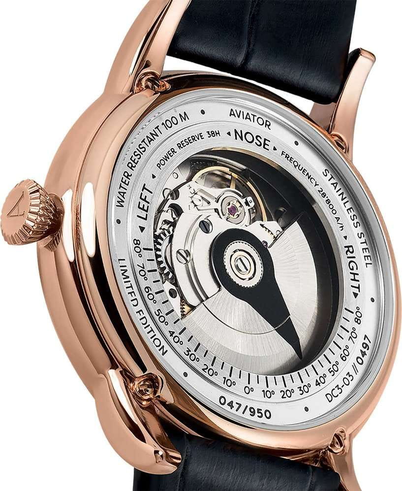 Aviator Douglas DC-3 V.3.32.2.242.4 — швейцарские часы в классике авиадизайна, сочетающие безупречную читаемость и высокую надёжность. Лимитированная серия. Корпус диаметром 45 мм выполнен из нержавеющей стали 316L с PVD-покрытиемPVDУльтратонкое покрытие наносится в технике вакуумного напыления, сочетает в себе нитрид титана особой прочности со слоем золота или оксида хрома. Несёт в себе декоративную или защитную функцию. цвета розового золота. Накладные метки выполнены в виде штрихов. Окошко даты находится в положении 6 часов. Часовые метки и стрелки покрыты люминесцентным покрытиемЛюминесцентное покрытиеПозволяет считывать показания времени в темноте. Производители наносят на стрелки, часовые индексы, безель или поверхность циферблата светонакопительный состав, дающий холодное свечение. Superluminova, позволяющим легко определять время даже в тёмное время суток. Поверхность защищена прочным сапфировым стекломСапфировое стеклоПрочный и надёжный материал из кристалла сапфира синтетического происхождения, характеризующийся особой твёрдостью и устойчивостью к царапинам и повреждениям. с антибликовым покрытием, устойчивым к царапинам. Сердце модели — швейцарский механизм Sellita SW 200, известный своей точностью и долговечностью. Водозащита 100 метров, позволит плавать, нырять и заниматься другими водными видами спорта. Завинчивающаяся головка и задняя крышка обеспечивают уверенную ударопрочностьУдаропрочный корпусМеханизм заключён в корпус, выполненный из современных материалов, устойчивых к ударам, механическим повреждениям и падению с высоты: инновационный пластик, карбон, нержавеющая сталь, титан. и надёжную защиту от влаги и пыли. В механизме 26 камней, запас хода 38 часов. Модель дополнена кожаным ремешком с выразительной текстурой и классическим стилем, закреплённым с помощью застёжке-бабочке с кнопкамиЗастёжка "бабочка"Такой вид застёжки дополняется предохранителями, помогающими избежать случайного раскрытия браслета. Обладают изящным исполнением. — для максимального комфорта и лёгкости в повседневном использовании. Циферблат выполнен по технологии sun-ray (солнечные лучи). Коллекция Douglas была разработана в честь известного американского пассажирского самолета Douglas DC-3. Aviator — это образец лётной точности, инженерной чёткости и сдержанной роскоши, идеально подходящий для тех, кто ценит функциональность и уверенность в каждом элементе.