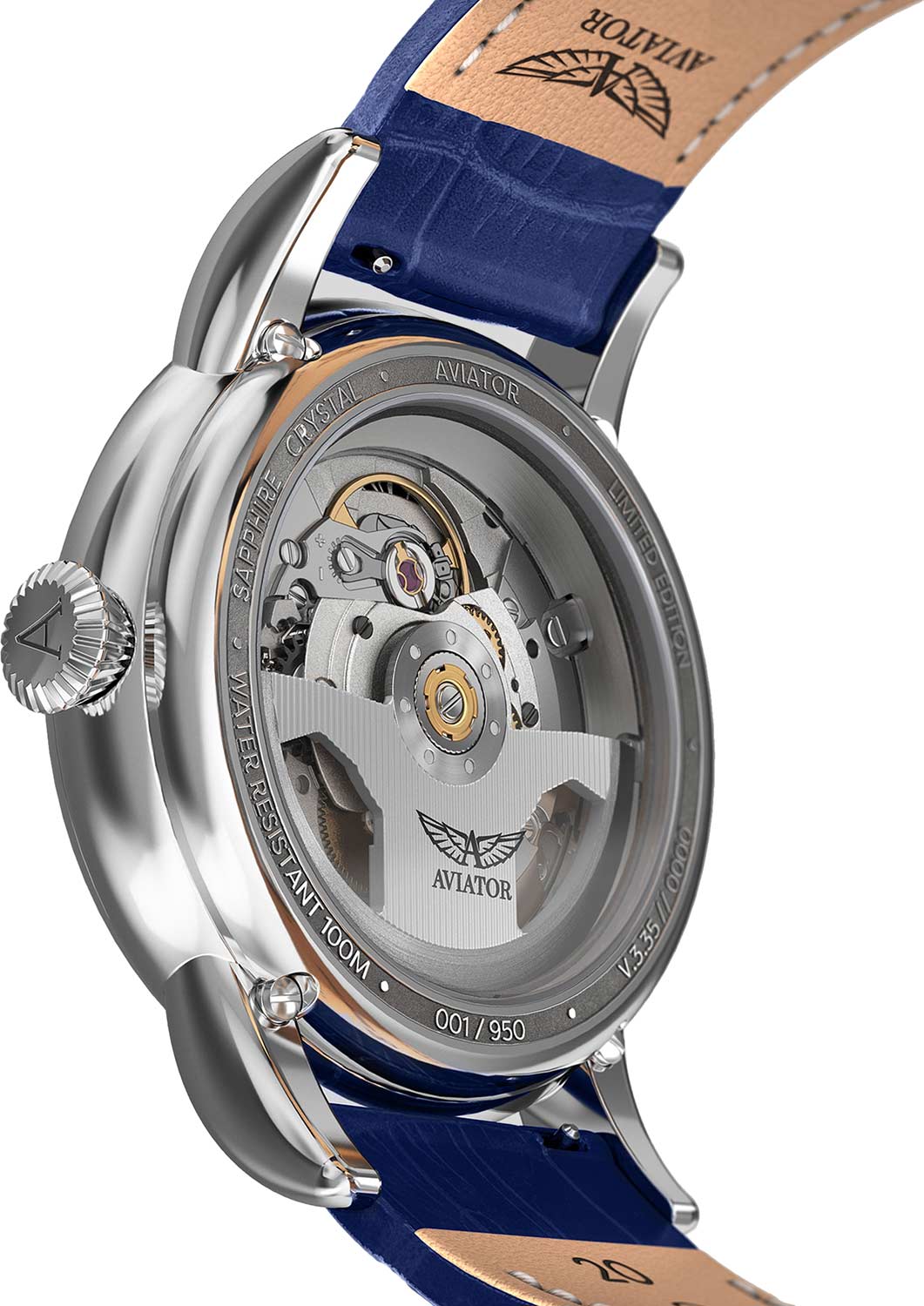 Aviator Douglas Day Date V.3.35.0.276.4 — швейцарские часы в классике авиадизайна, сочетающие безупречную читаемость и высокую надёжность. Лимитированная серия. Корпус диаметром 41,2 мм выполнен из нержавеющей стали 316L. Накладные метки выполнены в виде римских цифр. Окошко даты находится в положении 6 часов. День недели находится в положении 12 часов. Часовые метки и стрелки покрыты люминесцентным покрытиемЛюминесцентное покрытиеПозволяет считывать показания времени в темноте. Производители наносят на стрелки, часовые индексы, безель или поверхность циферблата светонакопительный состав, дающий холодное свечение. Superluminova, позволяющим легко определять время даже в тёмное время суток. Поверхность защищена прочным сапфировым стекломСапфировое стеклоПрочный и надёжный материал из кристалла сапфира синтетического происхождения, характеризующийся особой твёрдостью и устойчивостью к царапинам и повреждениям. с антибликовым покрытием, устойчивым к царапинам. Сердце модели — швейцарский механизм Sellita SW 240-1, известный своей точностью и долговечностью. Водозащита 100 метров, позволит плавать, нырять и заниматься другими водными видами спорта. Завинчивающаяся головка и задняя крышка обеспечивают уверенную ударопрочностьУдаропрочный корпусМеханизм заключён в корпус, выполненный из современных материалов, устойчивых к ударам, механическим повреждениям и падению с высоты: инновационный пластик, карбон, нержавеющая сталь, титан. и надёжную защиту от влаги и пыли. В механизме 26 камней, запас хода до 41 час. Модель дополнена кожаным ремешком с выразительной текстурой и классическим стилем, закреплённым с помощью застёжке-бабочке с кнопкамиЗастёжка "бабочка"Такой вид застёжки дополняется предохранителями, помогающими избежать случайного раскрытия браслета. Обладают изящным исполнением. — для максимального комфорта и лёгкости в повседневном использовании. Модель вдохновлена американским пассажирским самолетом Douglas DC-3, который является одним из лучших самолетов за всю историю авиации. Aviator — это образец лётной точности, инженерной чёткости и сдержанной роскоши, идеально подходящий для тех, кто ценит функциональность и уверенность в каждом элементе.