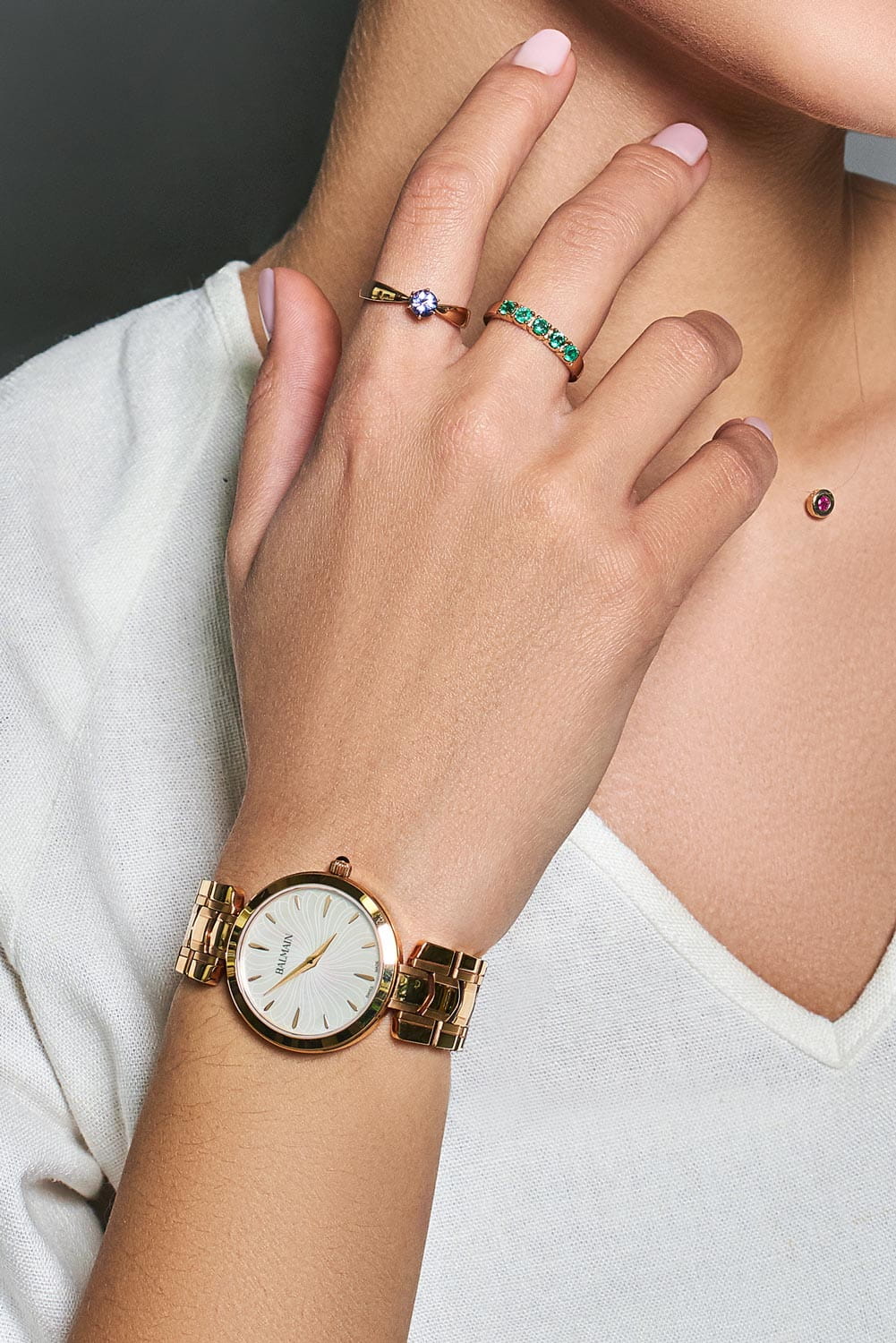 Женские часы Balmain Madrigal Lady III B4279.33.86 кварцевый механизм с высокой точностью. Сапфировое стеклоСапфировое стеклоПрочный и надёжный материал из кристалла сапфира синтетического происхождения, характеризующийся особой твёрдостью и устойчивостью к царапинам и повреждениям. устойчивое к появлению царапин, обладающее высокой прозрачностью. Корпус изготовлен из нержавеющей стали PVD-покрытиемPVDУльтратонкое покрытие наносится в технике вакуумного напыления, сочетает в себе нитрид титана особой прочности со слоем золота или оксида хрома. Несёт в себе декоративную или защитную функцию.. Класс водозащиты: 50 метров, позволит защитить корпус от случайных брызг или капель дождя. Стальной браслет с PVD-покрытиемPVDУльтратонкое покрытие наносится в технике вакуумного напыления, сочетает в себе нитрид титана особой прочности со слоем золота или оксида хрома. Несёт в себе декоративную или защитную функцию. на застёжке «бабочка» с кнопкамиЗастёжка "бабочка"Такой вид застёжки дополняется предохранителями, помогающими избежать случайного раскрытия браслета. Обладают изящным исполнением. . БезельБезельВнешний ободок, закрепляющий стекло. В спортивных часах так называется поворотное кольцо с делениями на циферблате, выполняет роль таймера – замеряет отрезки времени на шкале. Неподвижный безель – элемент декора. Однонаправленно вращающийся безель на дайверских часах позволяет фиксировать моменты погружения и выныривания на поверхность. с PVD-покрытиемPVDУльтратонкое покрытие наносится в технике вакуумного напыления, сочетает в себе нитрид титана особой прочности со слоем золота или оксида хрома. Несёт в себе декоративную или защитную функцию..