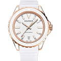 Женские часы Balmain Ophrys B4336.22.25 c кварцевый механизм с высокой точностью. Сапфировое стеклоСапфировое стеклоПрочный и надёжный материал из кристалла сапфира синтетического происхождения, характеризующийся особой твёрдостью и устойчивостью к царапинам и повреждениям. устойчивое к появлению царапин, обладающее высокой прозрачностью. Корпус изготовлен из нержавеющей стали. Класс водозащиты: 200 метров, позволит плавать, нырять и заниматься другими водными видами спорта. Каучуковый браслет на стандартной застежке. БезельБезельВнешний ободок, закрепляющий стекло. В спортивных часах так называется поворотное кольцо с делениями на циферблате, выполняет роль таймера – замеряет отрезки времени на шкале. Неподвижный безель – элемент декора. Однонаправленно вращающийся безель на дайверских часах позволяет фиксировать моменты погружения и выныривания на поверхность. с PVD-покрытиемPVDУльтратонкое покрытие наносится в технике вакуумного напыления, сочетает в себе нитрид титана особой прочности со слоем золота или оксида хрома. Несёт в себе декоративную или защитную функцию.. Дата в положении 6 часов. Стрелки и метки с люминесцентным покрытиемЛюминесцентное покрытиеПозволяет считывать показания времени в темноте. Производители наносят на стрелки, часовые индексы, безель или поверхность циферблата светонакопительный состав, дающий холодное свечение..