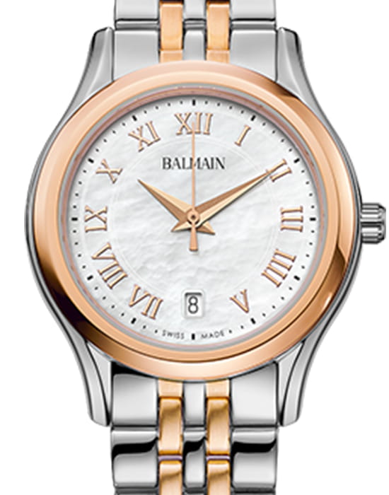 Женские часы Balmain Beleganza B8348.33.82 c кварцевый механизм с высокой точностью. Сапфировое стеклоСапфировое стеклоПрочный и надёжный материал из кристалла сапфира синтетического происхождения, характеризующийся особой твёрдостью и устойчивостью к царапинам и повреждениям. устойчивое к появлению царапин, обладающее высокой прозрачностью. Корпус изготовлен из нержавеющей стали. Класс водозащиты: 50 метров, позволит защитить корпус от случайных брызг или капель дождя. Стальной браслет с частичным PVD-покрытиемPVDУльтратонкое покрытие наносится в технике вакуумного напыления, сочетает в себе нитрид титана особой прочности со слоем золота или оксида хрома. Несёт в себе декоративную или защитную функцию.. на застёжке «бабочка» с кнопкамиЗастёжка "бабочка"Такой вид застёжки дополняется предохранителями, помогающими избежать случайного раскрытия браслета. Обладают изящным исполнением. . БезельБезельВнешний ободок, закрепляющий стекло. В спортивных часах так называется поворотное кольцо с делениями на циферблате, выполняет роль таймера – замеряет отрезки времени на шкале. Неподвижный безель – элемент декора. Однонаправленно вращающийся безель на дайверских часах позволяет фиксировать моменты погружения и выныривания на поверхность. с PVD-покрытиемPVDУльтратонкое покрытие наносится в технике вакуумного напыления, сочетает в себе нитрид титана особой прочности со слоем золота или оксида хрома. Несёт в себе декоративную или защитную функцию.. Календарь в позиции 6 часов.