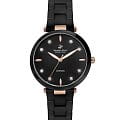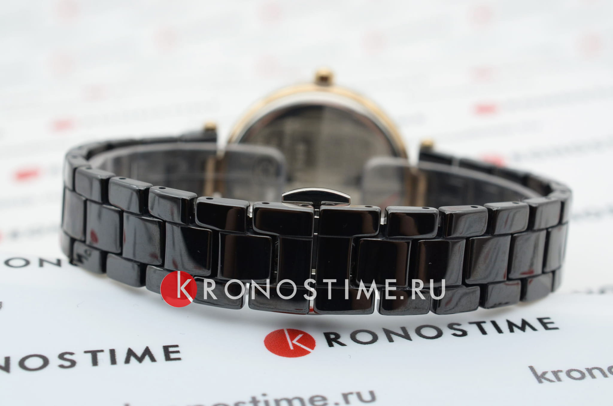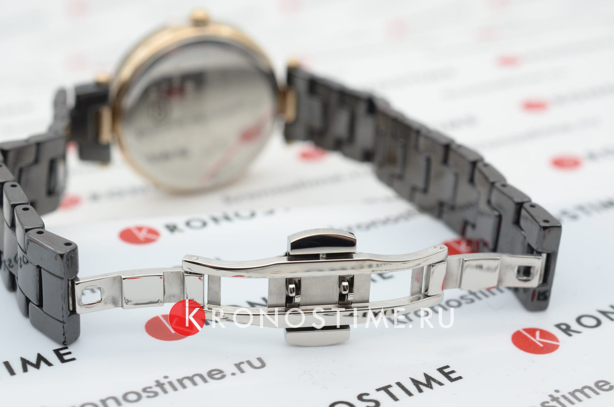 Браслет из черной керамики оснащён застёжкой 'бабочка'Застёжка "бабочка"Такой вид застёжки дополняется предохранителями, помогающими избежать случайного раскрытия браслета. Обладают изящным исполнением. , обеспечивающей комфортное ношение и надёжную фиксацию на запястье. Водозащита до 50 метров (5 ATM) защищает часы от случайных брызг и дождя, делая их подходящими для повседневного использования.