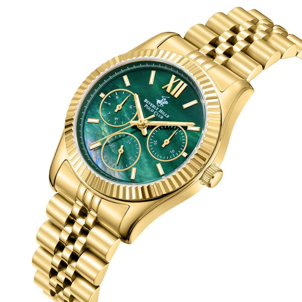 Beverly Hills Polo Club BP3169C.170 — женские часы, сочетающие изящество и функциональность в компактном формате. Корпус из суперметалла диаметром 34 мм и браслет украшены IP‑покрытиемIP-покрытиеМетод ионного напыления. Демонстрирует повышенную устойчивость к истиранию, окислению и химическим веществам. Под воздействием высокого давления и температуры около 1500°C молекулы металла надёжно соединяются с частицами корпуса часов. золотого оттенка, создавая благородный двуцветный дизайн. Циферблат украшен тремя субциферблатами — индикаторы даты, дня недели и 24‑часового формата — что придаёт модели утончённую многозадачность. Стрелки и метки выполнены в золоте, подчёркивая элегантность и визуальную лёгкость. Механизм — точный кварцевый, надёжный и неприхотливый, требующий только замены батареи раз в 1–2 года . Циферблат покрыт прочным минеральным стекломМинеральное стеклоМинеральное стекло представляет собой искусственно выращенный минерал кварца. Такое стекло отличается особой устойчивостью к повреждениям и царапинам. Уступает по некоторым качествам сапфировому стеклу., устойчивым к царапинам и сохраняющим безупречный внешний вид . Браслет на раскладной застёжкеРаскладная застёжкаТакой тип застёжки используется только на браслетах из металла. Она никогда не раскрывается полностью, происходит разделение на 2 и более частей. Раскладывающая застёжка снизит вероятность потери часов к минимуму., обеспечивая плавное и надёжное прилегание. Водозащита на уровне 3 ATM (≈30 м) защищает от брызг и случайных осадков . Beverly Hills Polo Club — утончённый аксессуар для женщин, ценящих стиль, надёжность и изысканные детали, где каждая функция подчёркнута строгой, но изящной эстетикой.