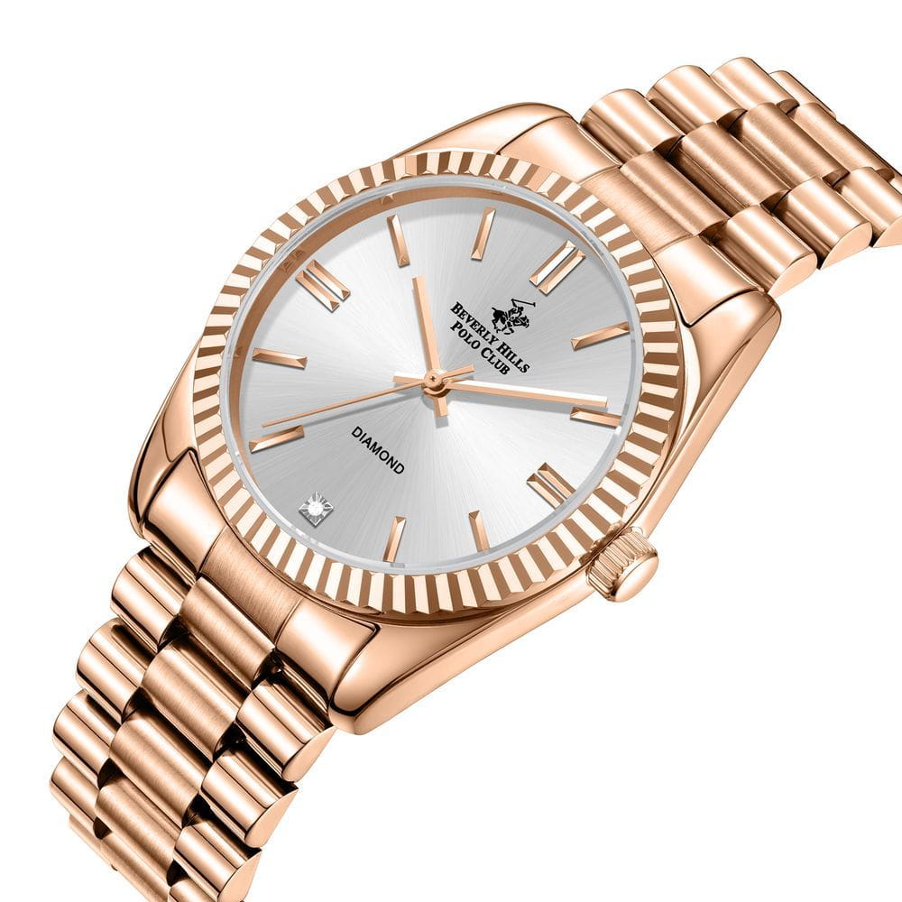 Beverly Hills Polo Club BP3172C.431 — женские часы, сочетающие изящество и функциональность в компактном формате. Корпус из суперметалла диаметром 36 мм и браслет украшены IP‑покрытиемIP-покрытиеМетод ионного напыления. Демонстрирует повышенную устойчивость к истиранию, окислению и химическим веществам. Под воздействием высокого давления и температуры около 1500°C молекулы металла надёжно соединяются с частицами корпуса часов. золотого оттенка, создавая благородный дизайн. Стрелки и метки выполнены в золоте, подчёркивая элегантность и визуальную лёгкость. Механизм — точный кварцевый, надёжный и неприхотливый, требующий только замены батареи раз в 1–2 года . Циферблат покрыт прочным минеральным стекломМинеральное стеклоМинеральное стекло представляет собой искусственно выращенный минерал кварца. Такое стекло отличается особой устойчивостью к повреждениям и царапинам. Уступает по некоторым качествам сапфировому стеклу., устойчивым к царапинам и сохраняющим безупречный внешний вид . Браслет на удобной раскладной застёжкеРаскладная застёжкаТакой тип застёжки используется только на браслетах из металла. Она никогда не раскрывается полностью, происходит разделение на 2 и более частей. Раскладывающая застёжка снизит вероятность потери часов к минимуму., обеспечивая плавное и надёжное прилегание. Водозащита на уровне 3 ATM (≈30 м) защищает от брызг и случайных осадков . Beverly Hills Polo Club — утончённый аксессуар для женщин, ценящих стиль, надёжность и изысканные детали, где каждая функция подчёркнута строгой, но изящной эстетикой.