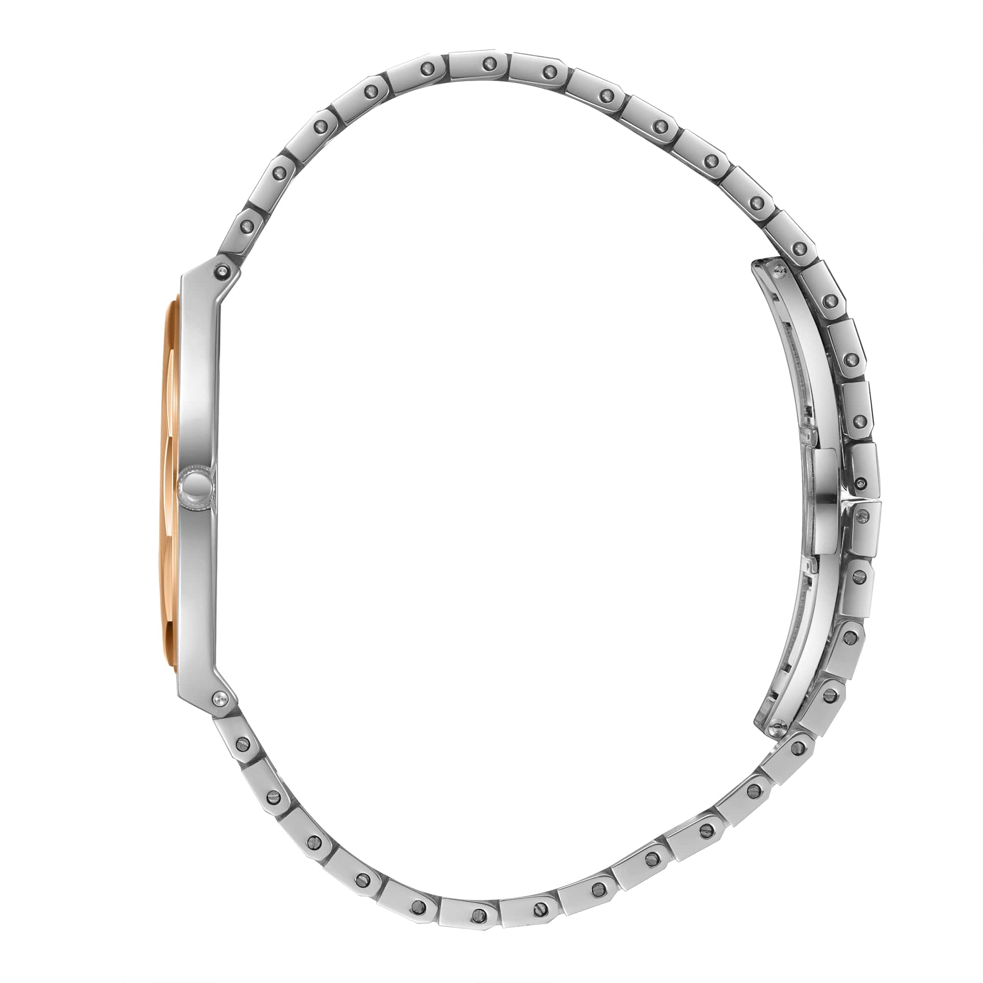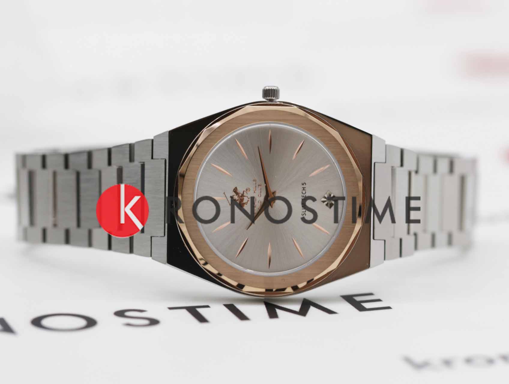 Beverly Hills Polo Club BP3668X.330 – элегантные женские часы, сочетающие стильный дизайн и высокую функциональность. Корпус диаметром 33 мм выполнен из стали, обеспечивающего прочность и долговечность. Циферблат украшен синтетическим бриллиантом, придающим модели роскошный вид, и защищён минеральным стекломМинеральное стеклоМинеральное стекло представляет собой искусственно выращенный минерал кварца. Такое стекло отличается особой устойчивостью к повреждениям и царапинам. Уступает по некоторым качествам сапфировому стеклу., устойчивым к царапинам. БезельБезельВнешний ободок, закрепляющий стекло. В спортивных часах так называется поворотное кольцо с делениями на циферблате, выполняет роль таймера – замеряет отрезки времени на шкале. Неподвижный безель – элемент декора. Однонаправленно вращающийся безель на дайверских часах позволяет фиксировать моменты погружения и выныривания на поверхность. с PVD-покрытиемPVDУльтратонкое покрытие наносится в технике вакуумного напыления, сочетает в себе нитрид титана особой прочности со слоем золота или оксида хрома. Несёт в себе декоративную или защитную функцию.. Часы оснащены точным кварцевым механизмом, гарантирующим надёжное отображение времени. Браслет из нержавеющей стали оснащён раскладной застёжкойРаскладная застёжкаТакой тип застёжки используется только на браслетах из металла. Она никогда не раскрывается полностью, происходит разделение на 2 и более частей. Раскладывающая застёжка снизит вероятность потери часов к минимуму., обеспечивающей комфортное ношение и надёжную фиксацию на запястье. Водозащита до 50 метров (5 ATM) позволяет использовать часы в повседневной жизни, включая кратковременное погружение в воду.