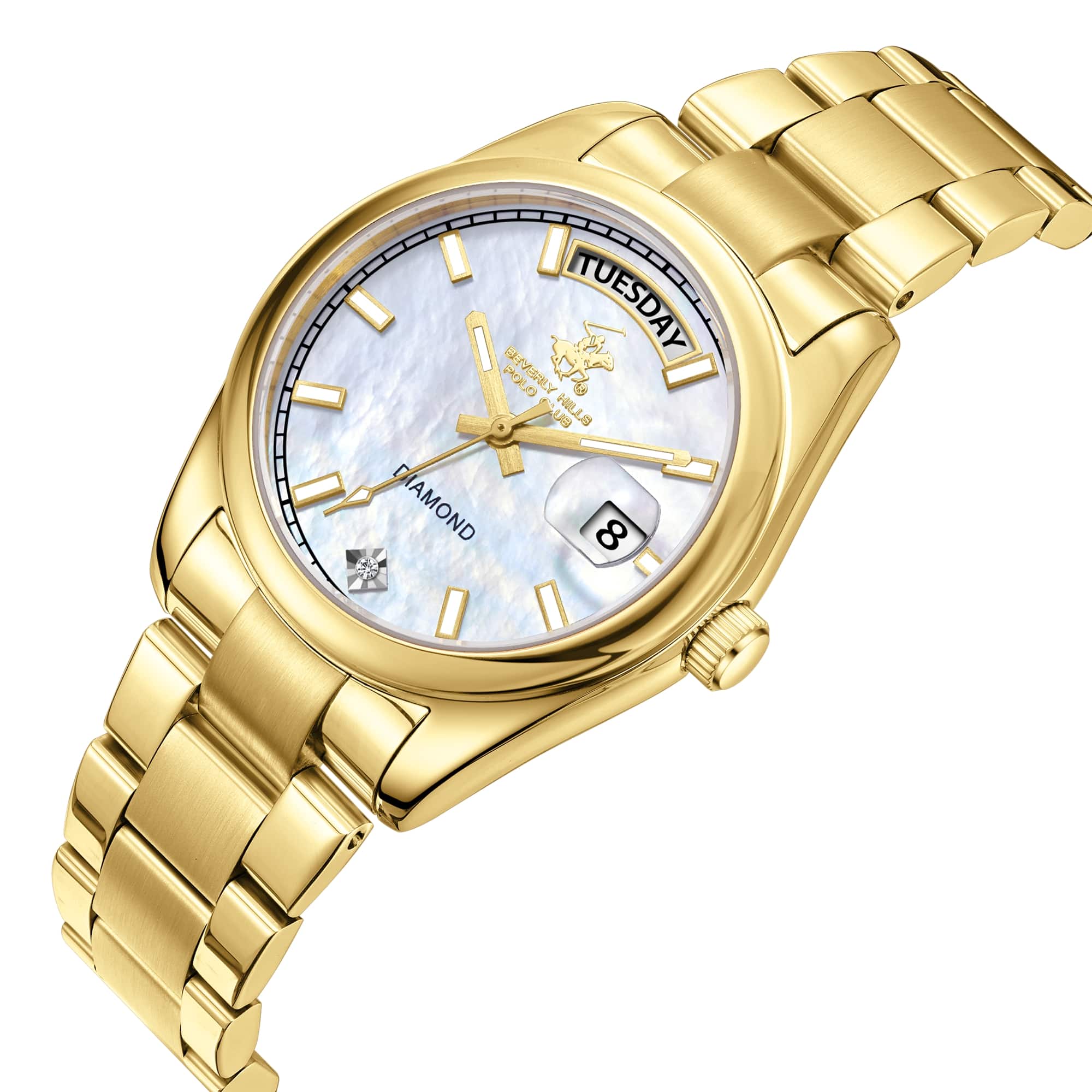 Beverly Hills Polo Club BP3709X.120 – элегантные женские часы, сочетающие стильный дизайн и высокую функциональность. Корпус диаметром 34 мм выполнен из стали с PVD-покрытиемPVDУльтратонкое покрытие наносится в технике вакуумного напыления, сочетает в себе нитрид титана особой прочности со слоем золота или оксида хрома. Несёт в себе декоративную или защитную функцию., обеспечивающего прочность и долговечность. Циферблат украшен синтетическим бриллиантом, придающим модели роскошный вид, и защищён минеральным стекломМинеральное стеклоМинеральное стекло представляет собой искусственно выращенный минерал кварца. Такое стекло отличается особой устойчивостью к повреждениям и царапинам. Уступает по некоторым качествам сапфировому стеклу., устойчивым к царапинам. Часы оснащены точным кварцевым механизмом, гарантирующим надёжное отображение времени. Браслет из нержавеющей стали с PVD-покрытиемPVDУльтратонкое покрытие наносится в технике вакуумного напыления, сочетает в себе нитрид титана особой прочности со слоем золота или оксида хрома. Несёт в себе декоративную или защитную функцию. оснащён раскладной застёжкойРаскладная застёжкаТакой тип застёжки используется только на браслетах из металла. Она никогда не раскрывается полностью, происходит разделение на 2 и более частей. Раскладывающая застёжка снизит вероятность потери часов к минимуму., обеспечивающей комфортное ношение и надёжную фиксацию на запястье. Водозащита до 50 метров (5 ATM) позволяет использовать часы в повседневной жизни, включая кратковременное погружение в воду.