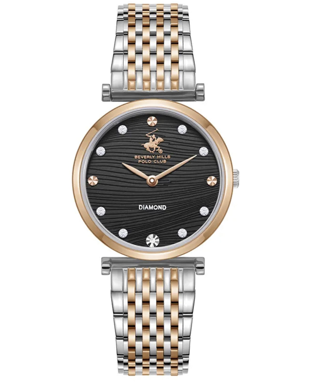 Женские кварцевые часы Beverly Hills Polo Club — это изысканный аксессуар в классическом стиле. Корпус диаметром 30 мм выполнен из нержавеющей стали. БезельБезельВнешний ободок, закрепляющий стекло. В спортивных часах так называется поворотное кольцо с делениями на циферблате, выполняет роль таймера – замеряет отрезки времени на шкале. Неподвижный безель – элемент декора. Однонаправленно вращающийся безель на дайверских часах позволяет фиксировать моменты погружения и выныривания на поверхность. с IP-покрытиемIP-покрытиеМетод ионного напыления. Демонстрирует повышенную устойчивость к истиранию, окислению и химическим веществам. Под воздействием высокого давления и температуры около 1500°C молекулы металла надёжно соединяются с частицами корпуса часов. цвета розового золота. Циферблат чёрного цвета оформлен метками, стрелками и инкрустирован синтетическими бриллиантами. Циферблат защищён минеральным стекломМинеральное стеклоМинеральное стекло представляет собой искусственно выращенный минерал кварца. Такое стекло отличается особой устойчивостью к повреждениям и царапинам. Уступает по некоторым качествам сапфировому стеклу.. Часы оснащены стальным браслетом с частичным IP-покрытиемIP-покрытиеМетод ионного напыления. Демонстрирует повышенную устойчивость к истиранию, окислению и химическим веществам. Под воздействием высокого давления и температуры около 1500°C молекулы металла надёжно соединяются с частицами корпуса часов. на застёжка «бабочка» с кнопкамиЗастёжка "бабочка"Такой вид застёжки дополняется предохранителями, помогающими избежать случайного раскрытия браслета. Обладают изящным исполнением. . Водонепроницаемость 50 м позволяет использовать часы в повседневных условиях. Идеальный выбор для тех, кто ценит универсальный дизайн и высокое качество.