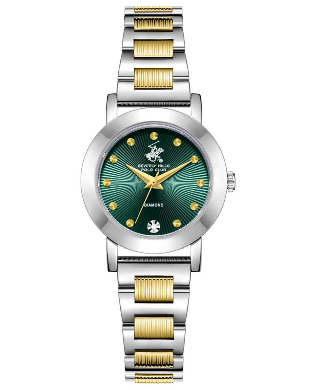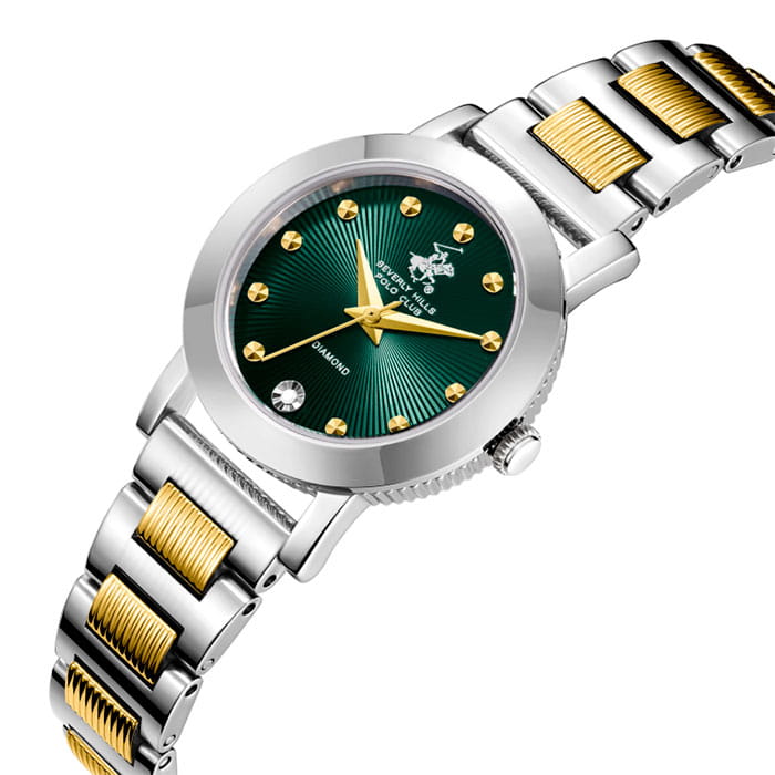 Женские кварцевые часы Beverly Hills Polo Club — это символ безупречного вкуса и роскоши. Корпус диаметром 28 мм выполнен из стали 316L. Циферблат зелёного цвета оформлен точками, стрелками и инкрустирован одним синтетическим бриллиантом. Циферблат защищён минеральным стекломМинеральное стеклоМинеральное стекло представляет собой искусственно выращенный минерал кварца. Такое стекло отличается особой устойчивостью к повреждениям и царапинам. Уступает по некоторым качествам сапфировому стеклу. с сапфировым покрытием. Часы оснащены стальным браслетом с частичным IP-покрытиемIP-покрытиеМетод ионного напыления. Демонстрирует повышенную устойчивость к истиранию, окислению и химическим веществам. Под воздействием высокого давления и температуры около 1500°C молекулы металла надёжно соединяются с частицами корпуса часов. цвета жёлтого золота на застёжке «бабочка» с кнопкамиЗастёжка "бабочка"Такой вид застёжки дополняется предохранителями, помогающими избежать случайного раскрытия браслета. Обладают изящным исполнением. . Водонепроницаемость 30 м позволяет использовать часы в повседневных условиях. Идеальный выбор для тех, кто ценит американское качество и универсальный дизайн.