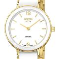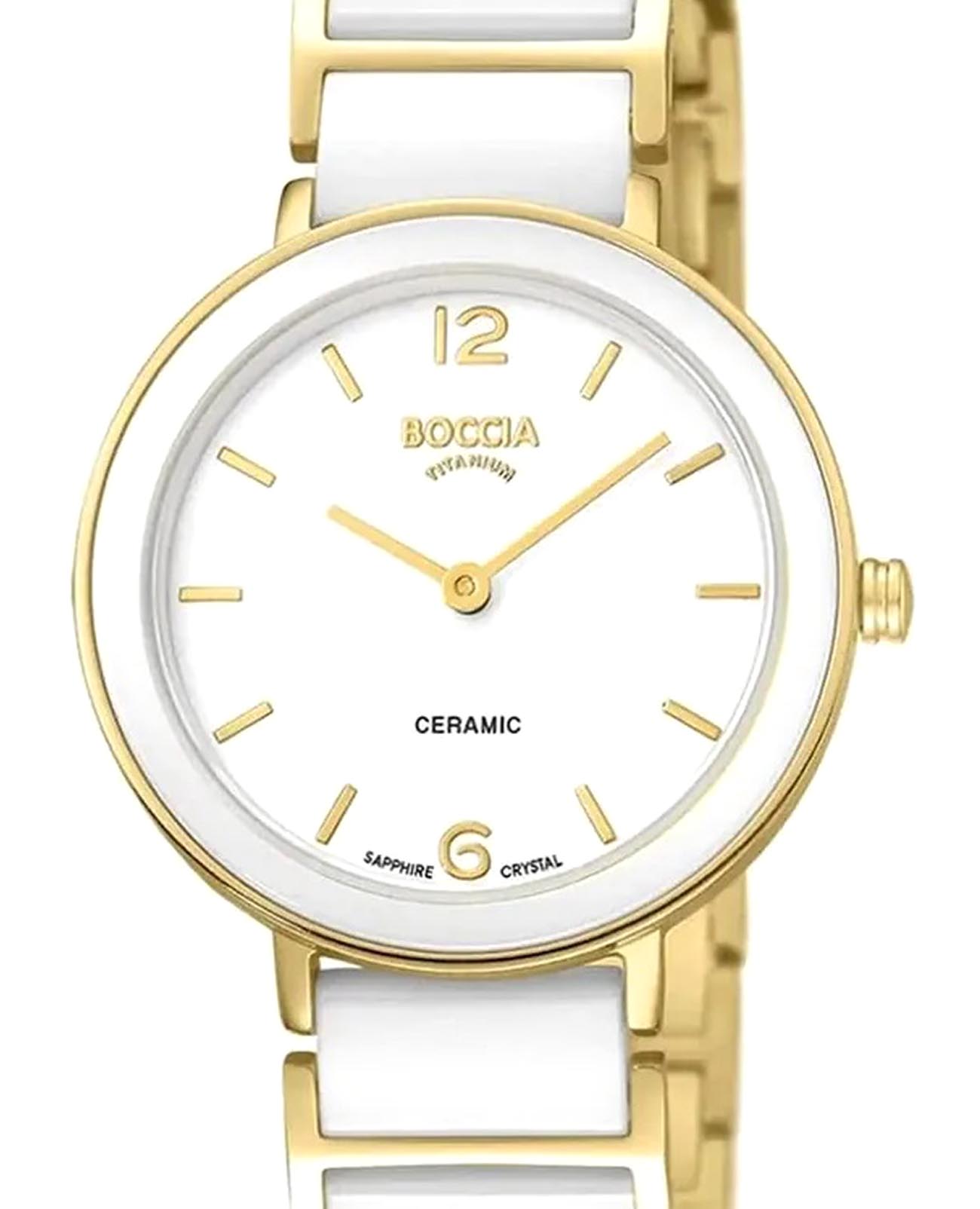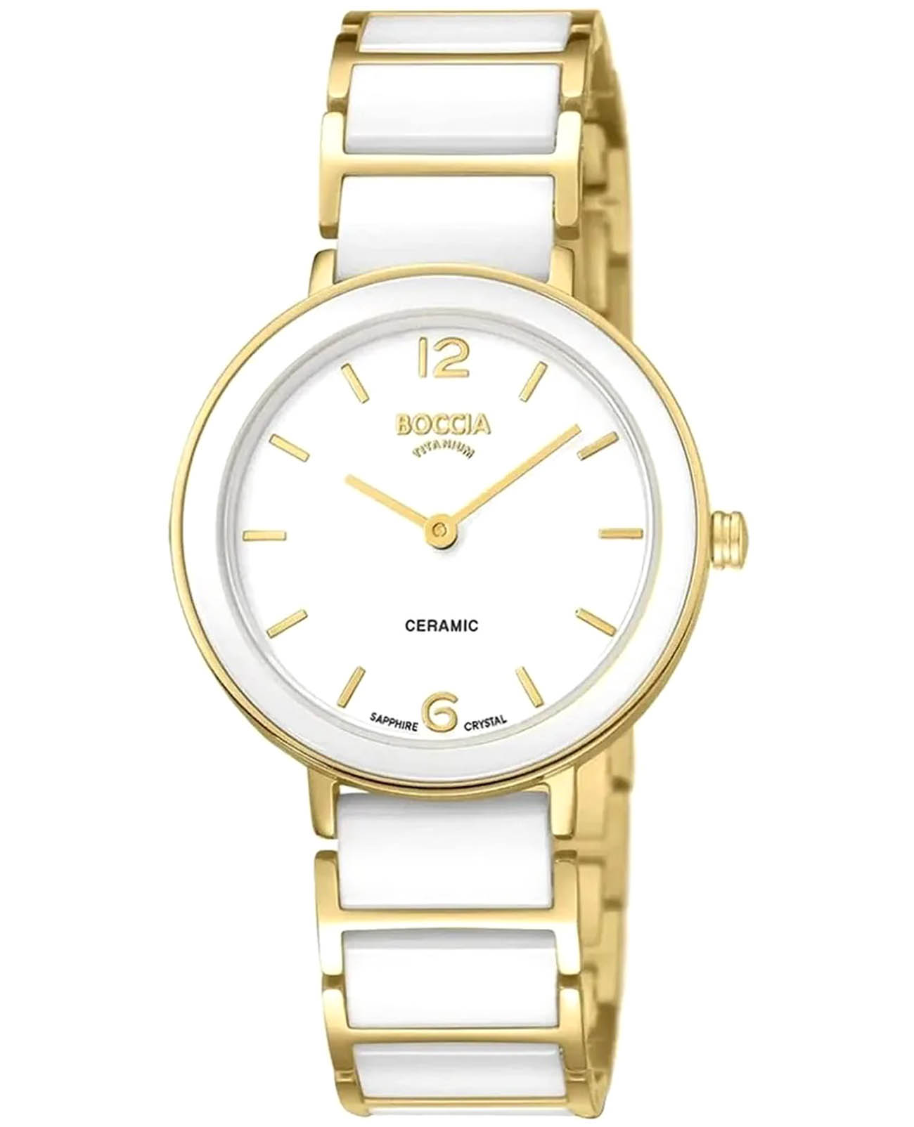 Женские немецкие титановые часы Boccia Titanium 3311-03 с надёжным кварцевым механизмом. Корпус изготовлен из титана диаметром 32мм подчеркивает современный дизайн модели. Сапфировое стеклоСапфировое стеклоПрочный и надёжный материал из кристалла сапфира синтетического происхождения, характеризующийся особой твёрдостью и устойчивостью к царапинам и повреждениям. устойчивое к появлению царапин, обладающее высокой прозрачностью. Титановый браслет с PVD-покрытиемPVDУльтратонкое покрытие наносится в технике вакуумного напыления, сочетает в себе нитрид титана особой прочности со слоем золота или оксида хрома. Несёт в себе декоративную или защитную функцию. и керамическими вставками на раскладной застёжкеРаскладная застёжкаТакой тип застёжки используется только на браслетах из металла. Она никогда не раскрывается полностью, происходит разделение на 2 и более частей. Раскладывающая застёжка снизит вероятность потери часов к минимуму. обеспечивает комфортное ношение. Циферблат с метками в виде штрихов. Керамический БезельБезельВнешний ободок, закрепляющий стекло. В спортивных часах так называется поворотное кольцо с делениями на циферблате, выполняет роль таймера – замеряет отрезки времени на шкале. Неподвижный безель – элемент декора. Однонаправленно вращающийся безель на дайверских часах позволяет фиксировать моменты погружения и выныривания на поверхность.. Класс водозащиты: 50 метров позволит защитить корпус от случайных брызг или капель дождя. Эти часы станут отличным выбором для тех, кто ценит стильный дизайн и функциональность в одном аксессуаре, подходят для ежедневного использования.