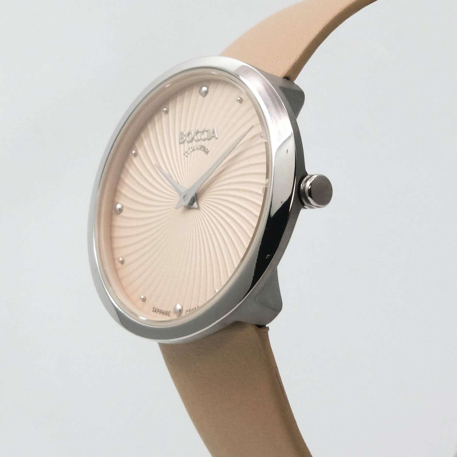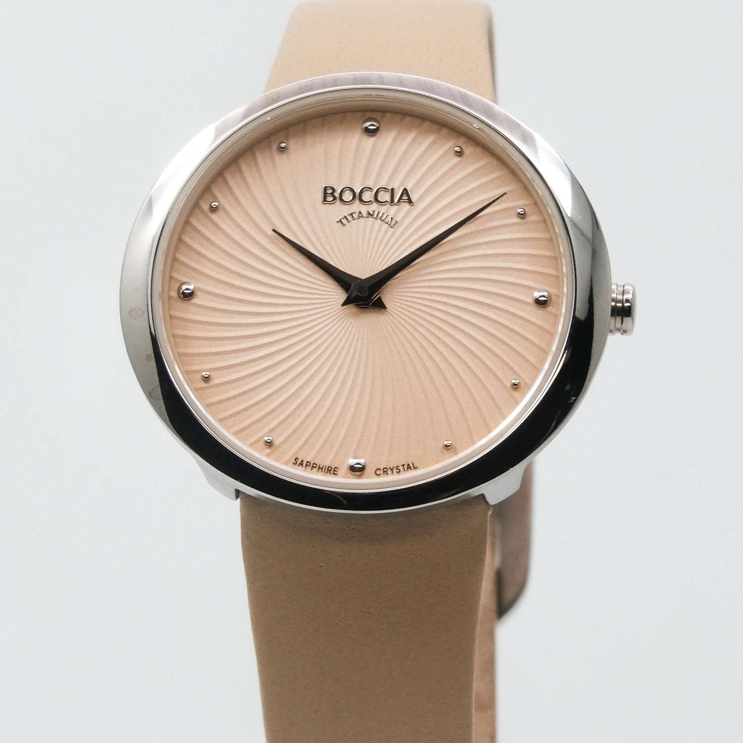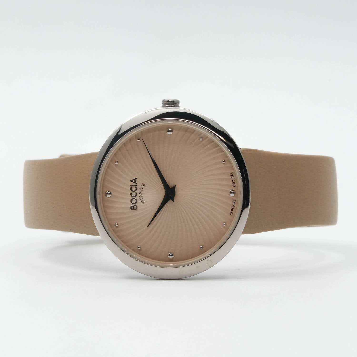 Женские часы Boccia Titanium 3364-02 станут прекрасным дополнением вашего стильного образа. Эти часы оснащены надежным кварцевым механизмом Miyota GL22, обеспечивающим точное время. Центральные часовая и минутная стрелки аккуратно выделяются на бежевом гильошированном циферблате, придавая часам элегантный вид. Корпус часов выполнен из суперлегкого титана, что делает их не только прочными, но и невероятно комфортными в ношении. Овальная форма корпуса размером 30 х 32 мм добавляет изысканности и утонченности. Бежевый кожаный ремешок с классической застежкой гармонично дополняет общий стиль часов. Сапфировое стеклоСапфировое стеклоПрочный и надёжный материал из кристалла сапфира синтетического происхождения, характеризующийся особой твёрдостью и устойчивостью к царапинам и повреждениям., устойчивое к появлению царапин, надежно защищает циферблат, обеспечивая долговечность и сохранение первоначального внешнего вида. Водостойкость уровня WR 50 позволяет не беспокоиться о попадании влаги при мытье рук или в дождливую погоду.
