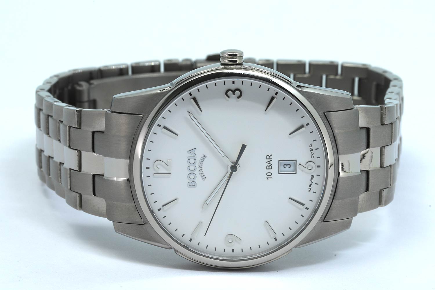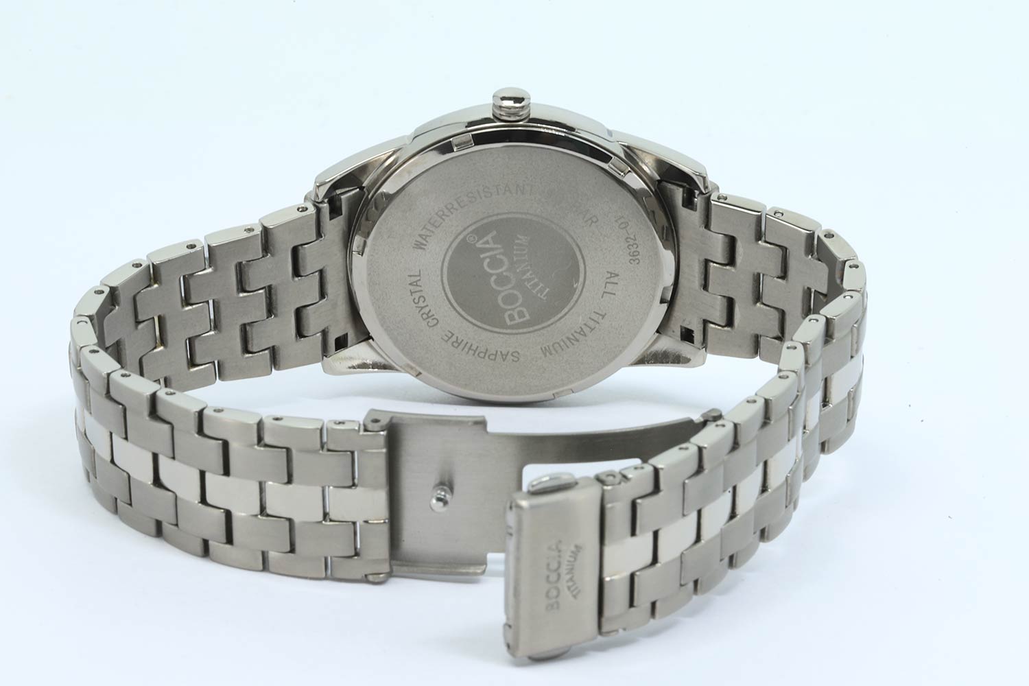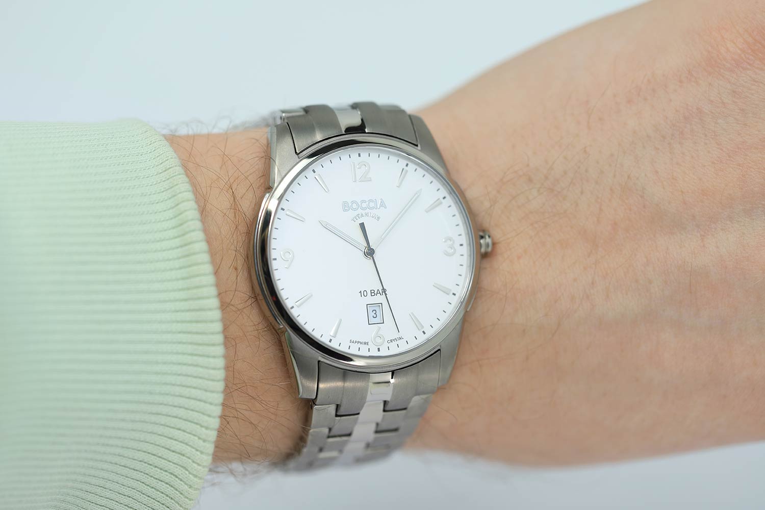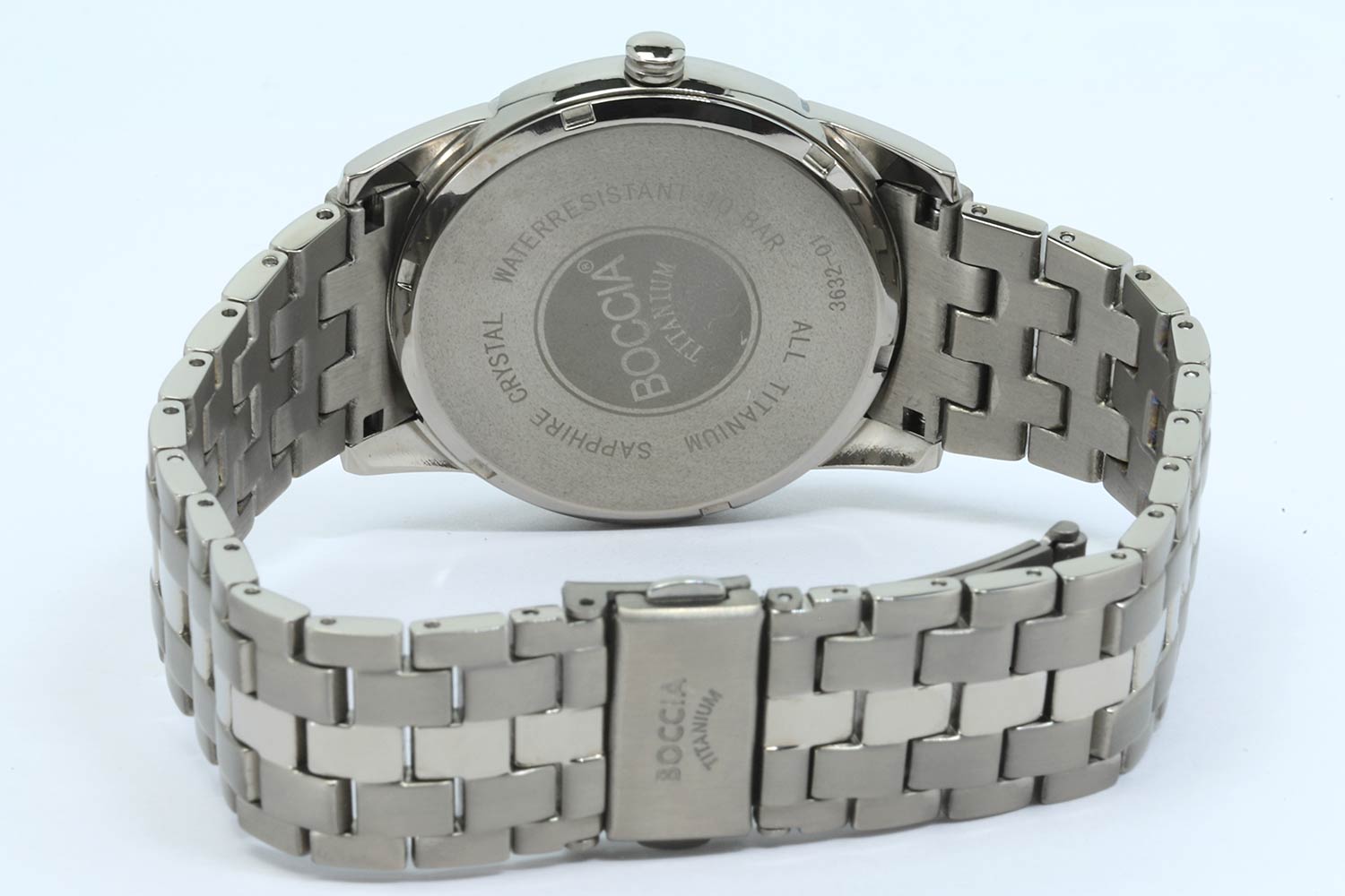 Мужские немецкие титановые часы Boccia Titanium 3632-01, кварцевый механизм с высокой точностью. Сапфировое стеклоСапфировое стеклоПрочный и надёжный материал из кристалла сапфира синтетического происхождения, характеризующийся особой твёрдостью и устойчивостью к царапинам и повреждениям. устойчивое к появлению царапин, обладающее высокой прозрачностью. Корпус изготовлен из титана. Стрелки с люминесцентным покрытиемЛюминесцентное покрытиеПозволяет считывать показания времени в темноте. Производители наносят на стрелки, часовые индексы, безель или поверхность циферблата светонакопительный состав, дающий холодное свечение.. Окошко даты в положении 6 часов. Класс водозащиты: 100 метров, позволит плавать, нырять и заниматься другими водными видами спорта. Браслет из титана на раскладной застёжкеРаскладная застёжкаТакой тип застёжки используется только на браслетах из металла. Она никогда не раскрывается полностью, происходит разделение на 2 и более частей. Раскладывающая застёжка снизит вероятность потери часов к минимуму..