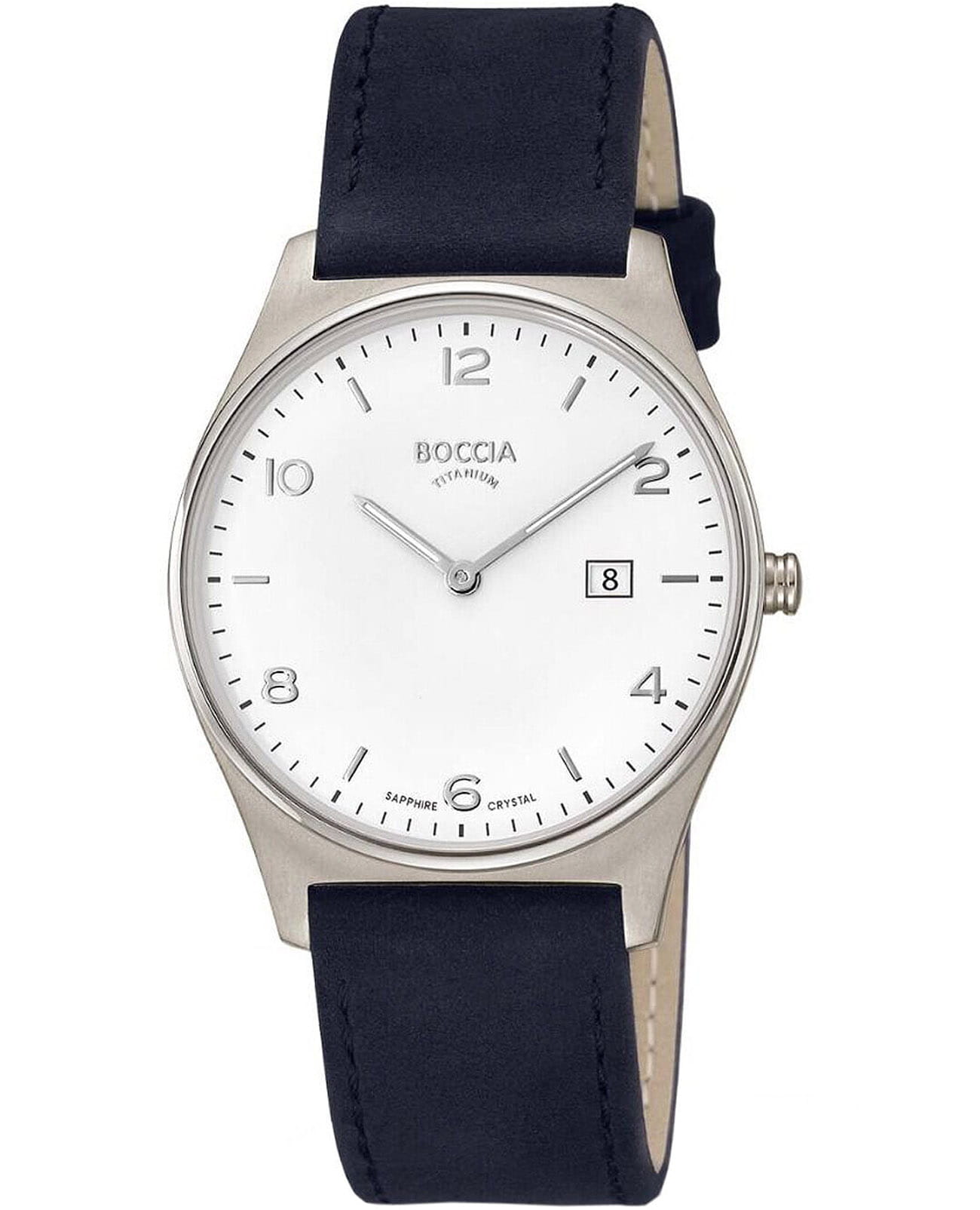 Мужские немецкие титановые часы Boccia Titanium 3655-01, кварцевый механизм с высокой точностью. Сапфировое стеклоСапфировое стеклоПрочный и надёжный материал из кристалла сапфира синтетического происхождения, характеризующийся особой твёрдостью и устойчивостью к царапинам и повреждениям. устойчивое к появлению царапин, обладающее высокой прозрачностью. Корпус изготовлен из титана. Класс водозащиты: 50 метров, позволит защитить корпус от случайных брызг или капель дождя. Кожаный ремешок на стандартной застёжке. Стрелки и метки с люминесцентным покрытиемЛюминесцентное покрытиеПозволяет считывать показания времени в темноте. Производители наносят на стрелки, часовые индексы, безель или поверхность циферблата светонакопительный состав, дающий холодное свечение..