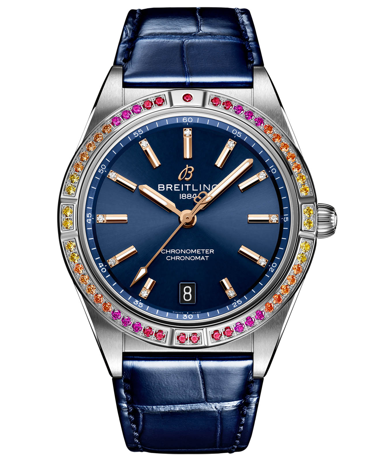 Эти элегантные часы в стиле современное ретро созданы для представительниц прекрасного пола, желающих выделиться из толпы. Chronomat South Sea легко узнать по специальным лакированным циферблатам с золотыми индексами и стрелками, инкрустированным бриллиантами часовым маркерам и украшенным драгоценными камнями безелем коктейльных оттенков. К ним по цвету были подобраны блестящие ремешки из кожи аллигатора с раскладными застежками.