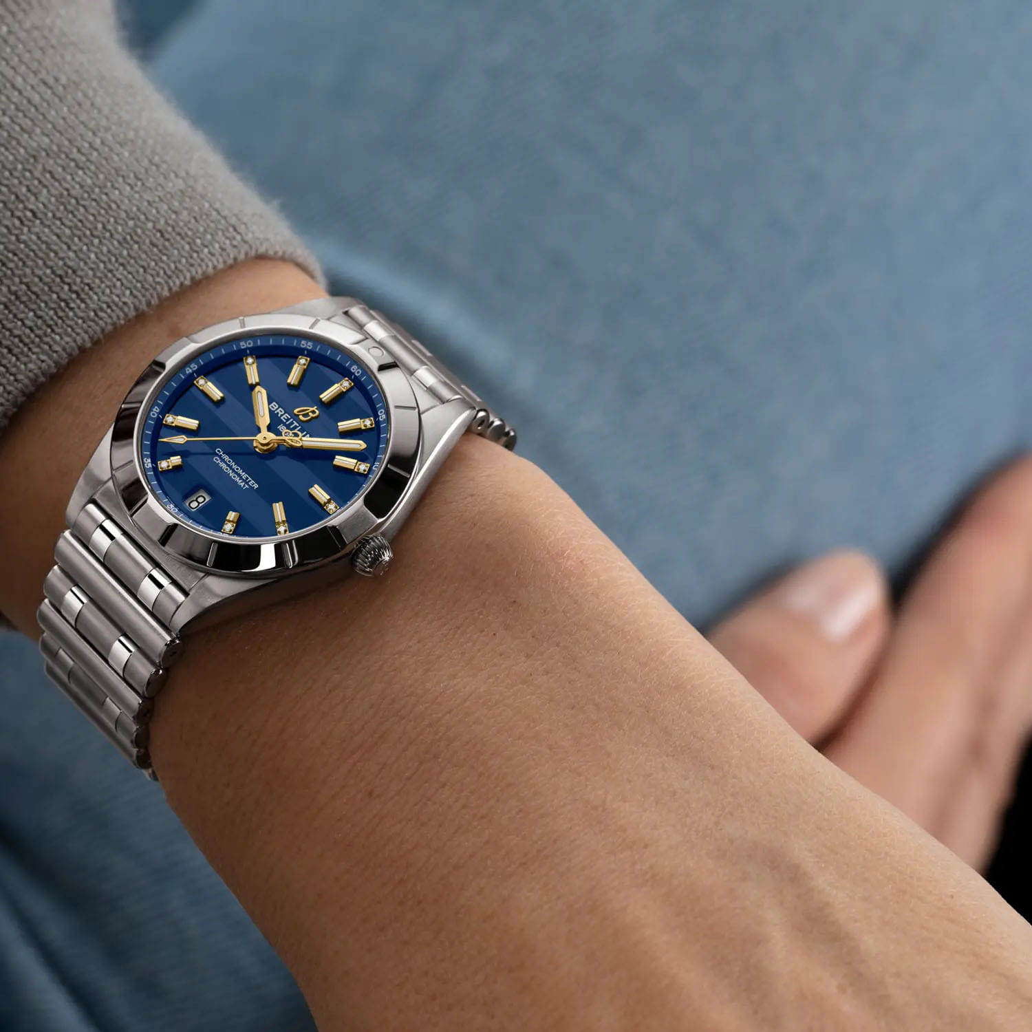 Женские кварцевые часы Breitling Chronomat 32 A773106A1C1A1 — это изысканный аксессуар, сочетающий в себе классический дизайн и современные технологии. Модель выполнена из нержавеющей стали с диаметром корпуса 32 мм и толщиной 8,54 мм, что делает её утончённой и лаконичной. Циферблат синего цвета дополнен 11 бриллиантами круглой огранки, придающими модели роскошный внешний вид. Защиту механизма обеспечивает сапфировое стеклоСапфировое стеклоПрочный и надёжный материал из кристалла сапфира синтетического происхождения, характеризующийся особой твёрдостью и устойчивостью к царапинам и повреждениям. с антибликовым покрытиемАнтибликовое покрытиеСлой оксида металла в 0,13-0,3 микрон, благодаря которому стекло часов не бликует и не отражает свет. Антибликовое покрытие уменьшает отражение света в 10 раз, обеспечивая отличную читаемость показателей циферблата., устойчивым к повреждениям. Браслет из нержавеющей стали оснащён застёжкой «бабочка» с кнопкамиЗастёжка "бабочка"Такой вид застёжки дополняется предохранителями, помогающими избежать случайного раскрытия браслета. Обладают изящным исполнением. , обеспечивающей комфорт и надёжную фиксацию на запястье. Часы оснащены кварцевым механизмом Breitling 77, обеспечивающим точную работу и минимальное обслуживание. Водонепроницаемость позволяет использовать модель при плавании и других водных активностях без глубокого погружения. На задней крышке выгравирован логотип спортивной команды, которой посвящена модель, и надпись «Один из 75». Это лимитированная серия, выпущенная всего 75 экземпляров, что подчёркивает её уникальность. Гарантия 2 года подтверждает качество и долговечность изделия. Эти часы станут универсальным аксессуаром для тех, кто ценит сочетание стиля, функциональности и швейцарского мастерства — идеальный выбор для повседневной носки и торжественных случаев.
