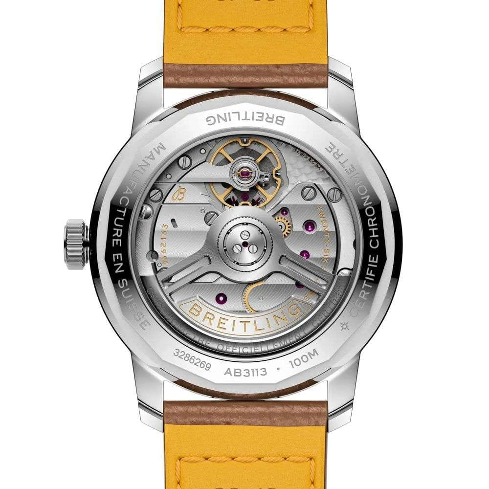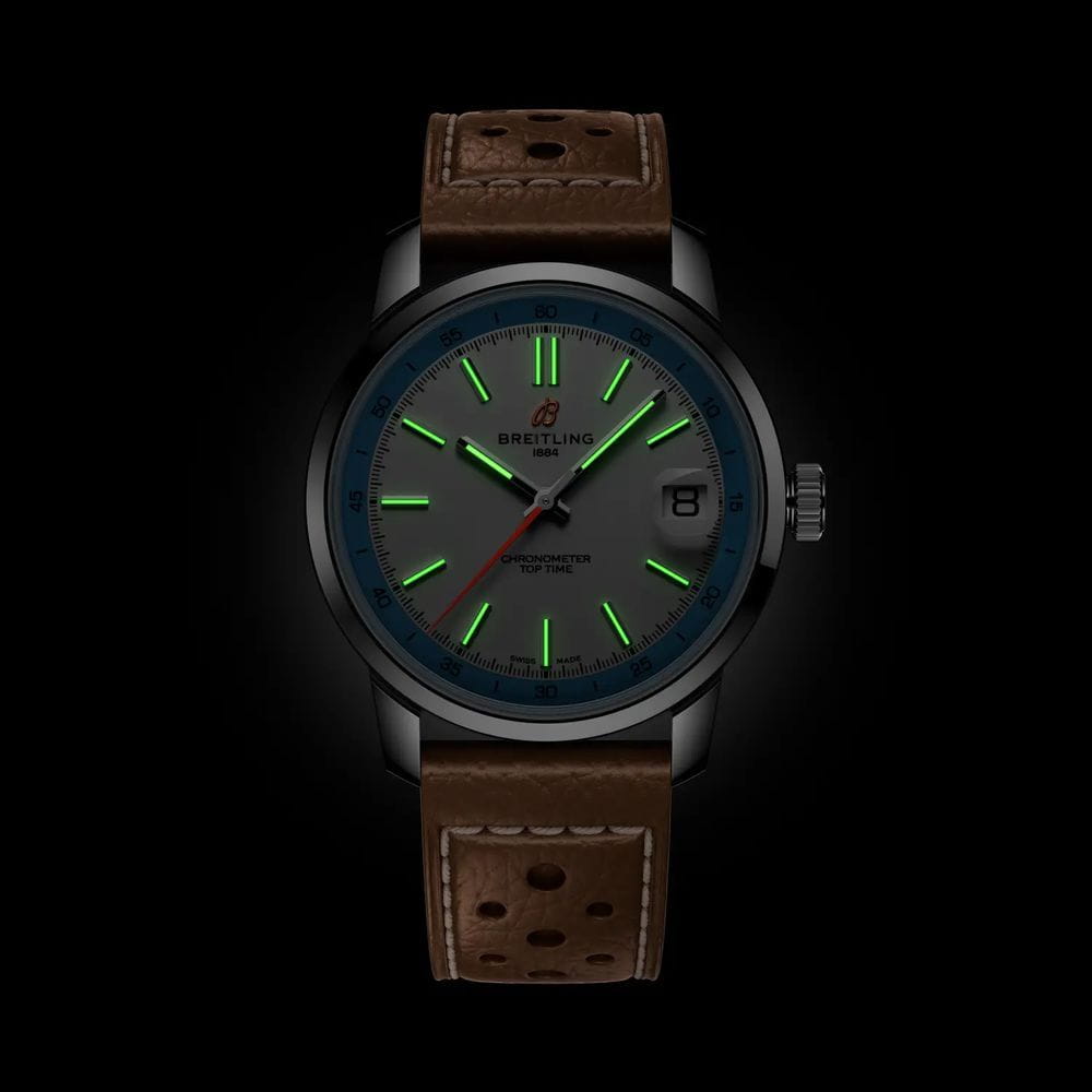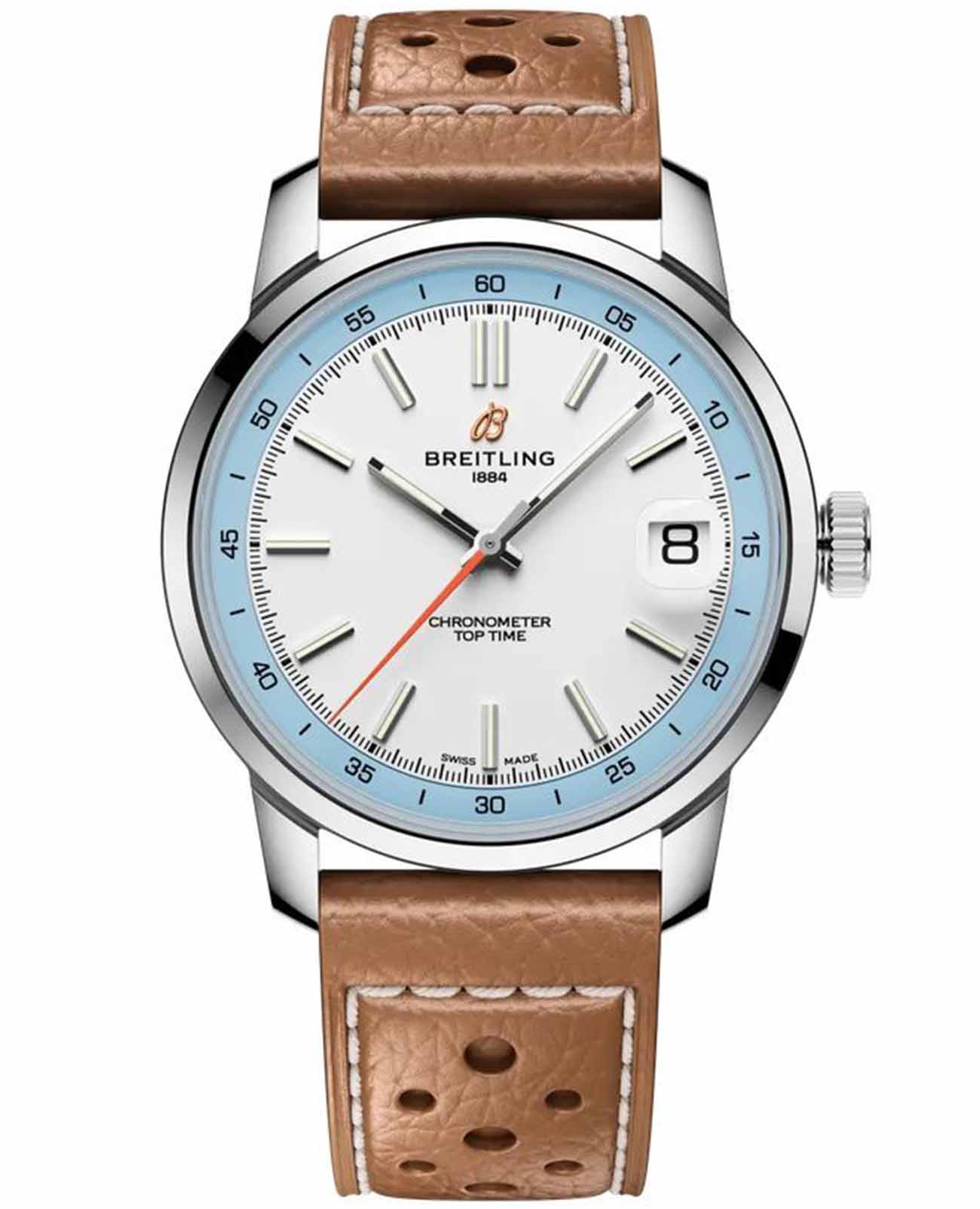 Breitling Top Time B31 AB3113281A1X1 — новаторская модель 2025 года, выполненная в духе ретро-дизайна и оснащённая новым автоматическим механизмом собственного производства. Корпус диаметром 38 мм изготовлен из нержавеющей стали с полированной отделкой. Задняя крышка с винтовым креплением и прозрачным окном демонстрирует работу калибра. Циферблат защищён выпуклым сапфировым стекломСапфировое стеклоПрочный и надёжный материал из кристалла сапфира синтетического происхождения, характеризующийся особой твёрдостью и устойчивостью к царапинам и повреждениям. с двухсторонним антибликовым покрытиемАнтибликовое покрытиеСлой оксида металла в 0,13-0,3 микрон, благодаря которому стекло часов не бликует и не отражает свет. Антибликовое покрытие уменьшает отражение света в 10 раз, обеспечивая отличную читаемость показателей циферблата.. Белый циферблат с бирюзовым внутренним кольцом оформлен в стиле классических приборных панелей. Часовые метки и стрелки покрыты люминесцентным покрытиемЛюминесцентное покрытиеПозволяет считывать показания времени в темноте. Производители наносят на стрелки, часовые индексы, безель или поверхность циферблата светонакопительный состав, дающий холодное свечение., обеспечивая читаемость при любом освещении. Внутри установлен новый автоматический калибр Breitling B31, отображающий часы, минуты и малую секундную стрелку. Запас хода составляет до 78 часов, а частота — 28 800 полуколебаний в час. Модель укомплектована перфорированным кожаным ремешком бежевого цвета с классической застёжкой-пряжкой. Водонепроницаемость 100 метров делает часы практичным выбором для повседневной активности. Top Time B31 AB3113281A1X1 — утончённый стиль, высокоточная механика и характерная винтажная подача в современной интерпретации.
