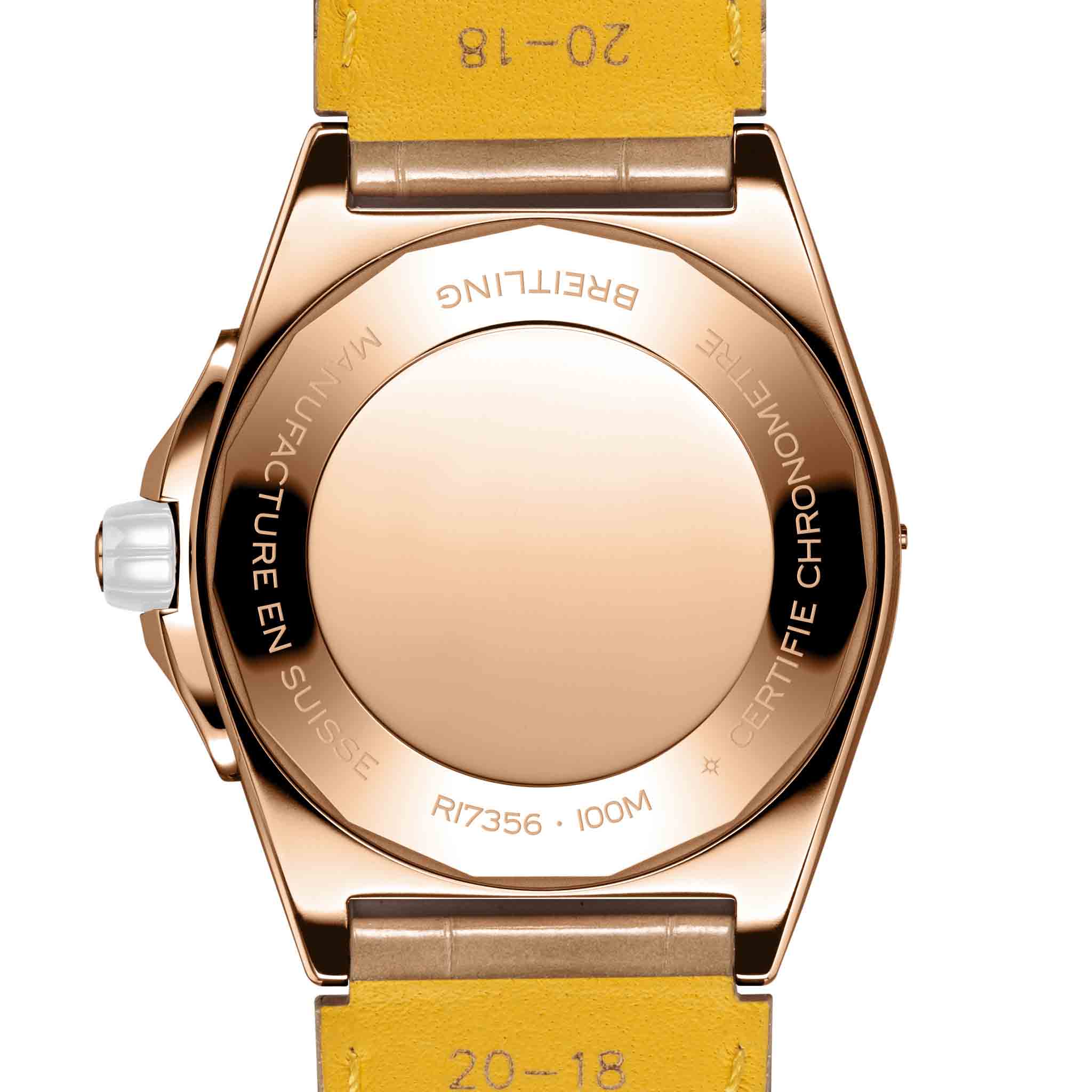 Женские швейцарские часы Breitling Super Chronomat Automatic 38 Origins R17356531G1P1, механический механизм (автоматический калибр) с высокой точностью. Сапфировое стеклоСапфировое стеклоПрочный и надёжный материал из кристалла сапфира синтетического происхождения, характеризующийся особой твёрдостью и устойчивостью к царапинам и повреждениям. устойчивое к появлению царапин, обладающее высокой прозрачностью. Класс водозащиты: 100 метров, позволит плавать, нырять и заниматься другими водными видами спорта. Корпус часов изготовлен из золота. Кожаный крокодиловый ремешок на стандартной застёжке. Отличить Super от остальных моделей семейства Chronomat можно по керамическим язычкам и заводной головке. Помимо улучшенного внешнего вида, Automatic 38 также имеет сияющую сторону. БезельБезельВнешний ободок, закрепляющий стекло. В спортивных часах так называется поворотное кольцо с делениями на циферблате, выполняет роль таймера – замеряет отрезки времени на шкале. Неподвижный безель – элемент декора. Однонаправленно вращающийся безель на дайверских часах позволяет фиксировать моменты погружения и выныривания на поверхность. из золота украшен крупными бриллиантами, выращенными в лабораторных условиях. Цвета циферблата добавляют как раз нужное количество привлекательности для глаз. Окошко даты находится в положении 6 часов. Стрелки и метки с люминесцентным покрытиемЛюминесцентное покрытиеПозволяет считывать показания времени в темноте. Производители наносят на стрелки, часовые индексы, безель или поверхность циферблата светонакопительный состав, дающий холодное свечение.. Breitling стимулирует перемены, создавая красивые продукты и впечатления с использованием лучших материалов, более совершенного производства и лучшей упаковки. Super Chronomat 38 Origins является важной вехой на этом пути. Часы украшены мелким золотом и бриллиантами, выращенными в лабораторных условиях. Эти драгоценные материалы можно проследить от их происхождения до часов на вашем запястье — и подробно просмотреть в отчете о происхождении, который прилагается к вашим часам в NFT, поддерживаемом блокчейном.