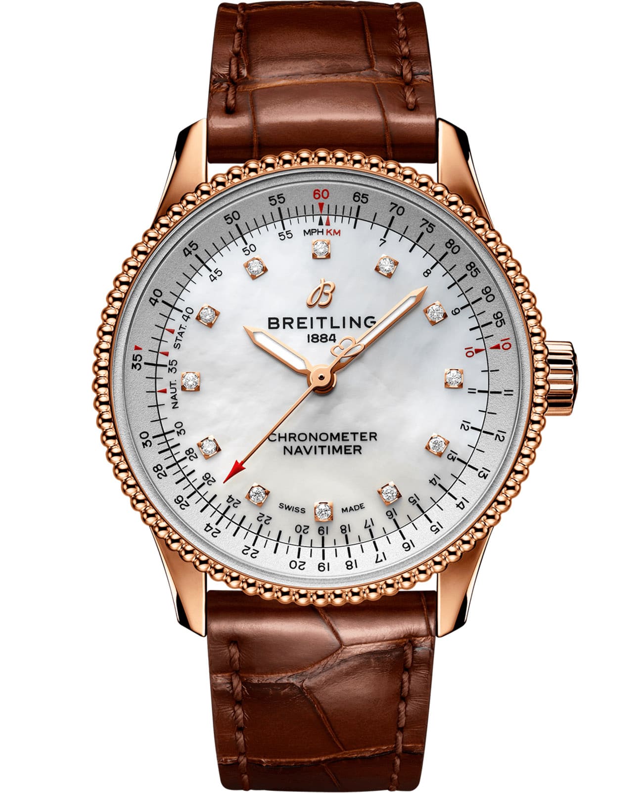 Часы Navitimer Automatic 35 предлагаются в комплекте с браслетом или блестящим синим, коричневым либо бордовым ремешком из кожи аллигатора с классической или раскладной застежкой из нержавеющей стали. Внутри корпуса спрятан мануфактурный калибр Breitling Caliber 17, сертифицированный Швейцарским институтом официального тестирования хронометров (COSC).