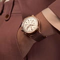 . Кожаный ремешок с раскладной застёжкойРаскладная застёжкаТакой тип застёжки используется только на браслетах из металла. Она никогда не раскрывается полностью, происходит разделение на 2 и более частей. Раскладывающая застёжка снизит вероятность потери часов к минимуму.. Стрелки с люминесцентным покрытиемЛюминесцентное покрытиеПозволяет считывать показания времени в темноте. Производители наносят на стрелки, часовые индексы, безель или поверхность циферблата светонакопительный состав, дающий холодное свечение.. Окошко даты находится в положении 6 часов.