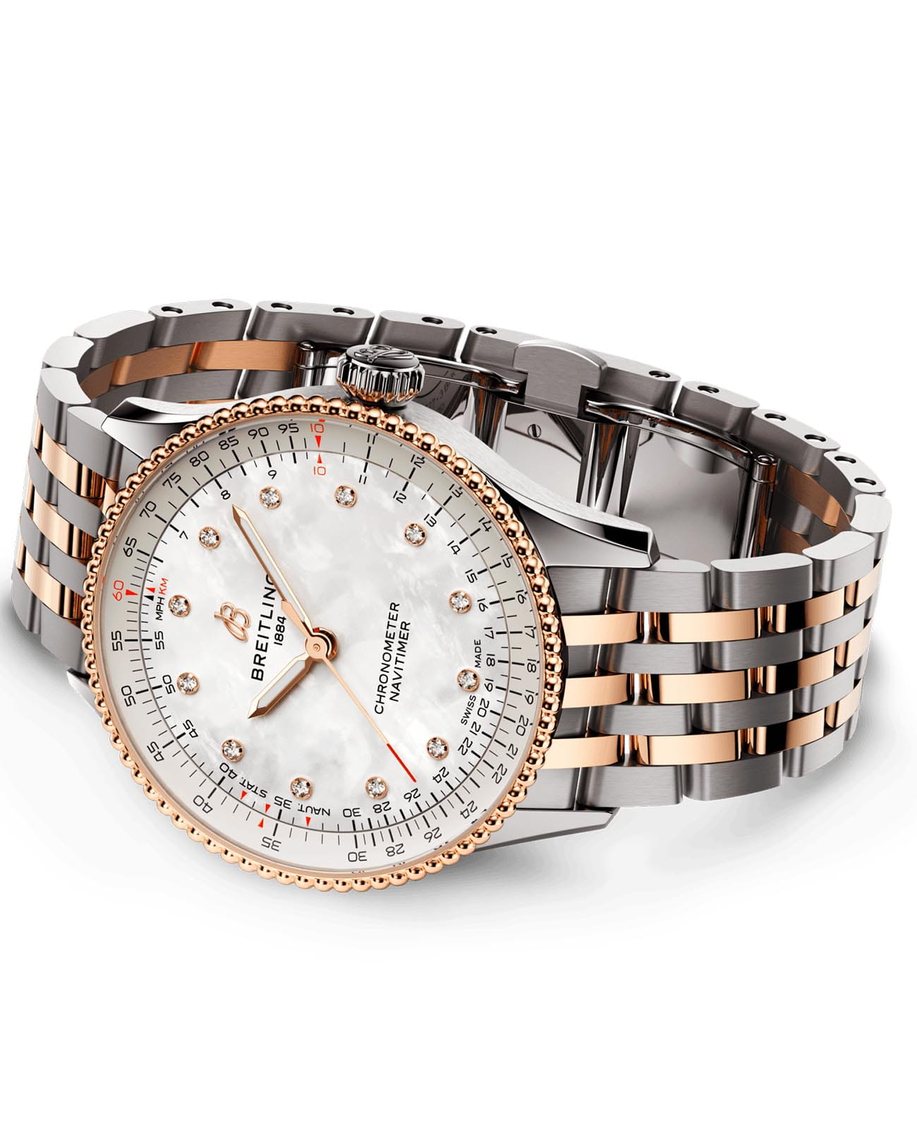 Швейцарские унисекс часы-хронометр Breitling Navitimer Automatic 36 U17327211A1U1, механический механизм (автоматический калибр) с высокой точностью. Сапфировое стеклоСапфировое стеклоПрочный и надёжный материал из кристалла сапфира синтетического происхождения, характеризующийся особой твёрдостью и устойчивостью к царапинам и повреждениям. устойчивое к появлению царапин, обладающее высокой прозрачностью. Класс водозащиты: 30 метров, позволит защитить корпус от случайных брызг или капель дождя. Корпус часов изготовлен из нержавеющей стали. Браслет из нержавеющей стали и красного 18-каратного золота18-каратное золотоОбозначение по каратной системе пробирования, оно показывает, сколько драгоценного металла содержится в изделии. 18 карат - в составе 75% чистого золота, соответствует 750 пробе.