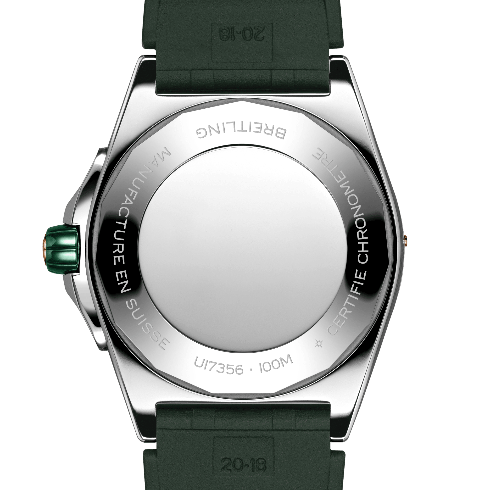 Женские швейцарские часы Breitling Super Chronomat Automatic 38 U17356531L1S1, механический механизм (автоматический калибр) с высокой точностью. Сапфировое стеклоСапфировое стеклоПрочный и надёжный материал из кристалла сапфира синтетического происхождения, характеризующийся особой твёрдостью и устойчивостью к царапинам и повреждениям. устойчивое к появлению царапин, обладающее высокой прозрачностью. Класс водозащиты: 100 метров, позволит плавать, нырять и заниматься другими водными видами спорта. Корпус часов изготовлен из стали. Силиконовый ремешок с раскладной застёжкойРаскладная застёжкаТакой тип застёжки используется только на браслетах из металла. Она никогда не раскрывается полностью, происходит разделение на 2 и более частей. Раскладывающая застёжка снизит вероятность потери часов к минимуму.. Отличить Super от остальных моделей семейства Chronomat можно по керамическим язычкам и заводной головке. Помимо улучшенного внешнего вида, Automatic 38 также имеет сияющую сторону. БезельБезельВнешний ободок, закрепляющий стекло. В спортивных часах так называется поворотное кольцо с делениями на циферблате, выполняет роль таймера – замеряет отрезки времени на шкале. Неподвижный безель – элемент декора. Однонаправленно вращающийся безель на дайверских часах позволяет фиксировать моменты погружения и выныривания на поверхность. из красного золота 18 карат украшен крупными бриллиантами, выращенными в лабораторных условиях. Цвета циферблата добавляют как раз нужное количество привлекательности для глаз. Окошко даты находится в положении 6 часов. Стрелки и метки с люминесцентным покрытиемЛюминесцентное покрытиеПозволяет считывать показания времени в темноте. Производители наносят на стрелки, часовые индексы, безель или поверхность циферблата светонакопительный состав, дающий холодное свечение..