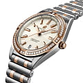 Выпуклое сапфировое стекло устойчивое к появлению царапин, обладающее высокой прозрачностью и антибликовым покрытием с обеих сторон. Класс водозащиты: 100 метров, позволит плавать, нырять и заниматься другими водными видами спорта. Корпус часов инкрустирован драгоценными камнями, изготовлен из нержавеющей стали и 18-каратного красного золота. Серебристый браслет Rouleaux с клипсой-бабочкой из нержавеющей стали и 18-каратного красного золота.