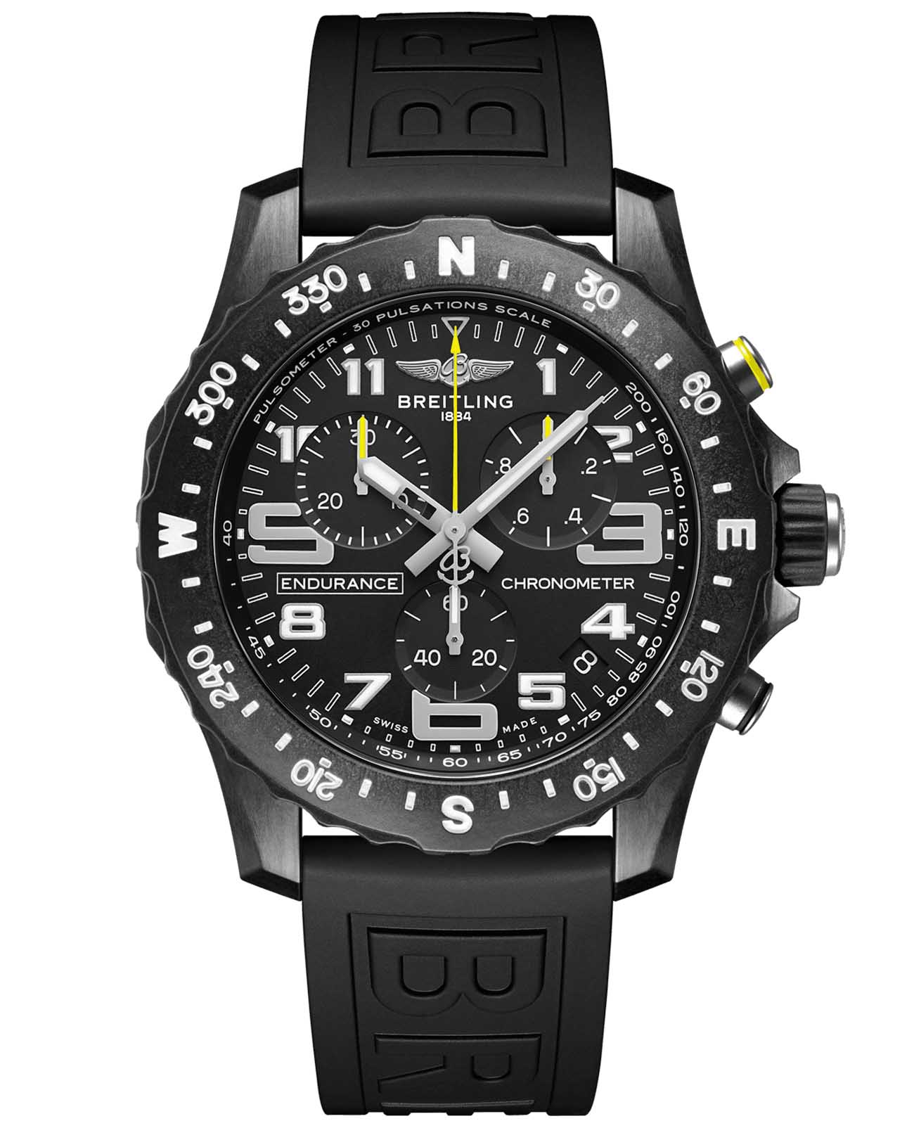 Швейцарские спортивные часы-хронографХронографФункция позволяет измерять отрезки времени с особой точностью: часы, минуты, секунды. Верным признаком хронографа является наличие на циферблате 3 дополнительных окошек-счётчиков. с секундомеромСекундомерСекундоме́р — прибор, способный измерять интервалы времени с точностью до долей секунды. Breitling Endurance Pro X82310E51B1S1, кварцевый механизм с высокой точностью. Разработанные как легкие часы для спортсменов, так и повседневный спортивный хронограф Endurance Pro идеально сочетают высокую точность и инновационные технологии с ярким и красочным дизайном. Сапфировое стеклоСапфировое стеклоПрочный и надёжный материал из кристалла сапфира синтетического происхождения, характеризующийся особой твёрдостью и устойчивостью к царапинам и повреждениям. с антибликовым покрытием устойчивое к появлению царапин, обладающее высокой прозрачностью. Класс водозащиты: 100 метров, позволит плавать, нырять и заниматься другими водными видами спорта. Корпус часов изготовлен из уникального материала Breitlight®, который в 3,3 раза легче титана и в 5,8 раза легче нержавеющей стали. Немагнитный, термостойкий и гипоаллергенный материал Breitlight ® обладает высокой устойчивостью к царапинам, сцеплению и коррозии. Стрелки и метки с люминесцентным покрытиемЛюминесцентное покрытиеПозволяет считывать показания времени в темноте. Производители наносят на стрелки, часовые индексы, безель или поверхность циферблата светонакопительный состав, дающий холодное свечение.. Силиконовый ремешок на стандартной застёжке. Часы имеют сертификат COSCСертификат COSCОфициальный сертификат, подтверждающий то, что часы ходят с особо высокой точностью. Для получения документа часы подвергаются тестовым испытаниям, разработанным швейцарским институтом тестирования хронометров COSC. Допустимая норма для механических часов -4/+6 секунд в день, для кварцевых моделей +/- 0,07 секунд в день.. Двунаправленный безельБезельВнешний ободок, закрепляющий стекло. В спортивных часах так называется поворотное кольцо с делениями на циферблате, выполняет роль таймера – замеряет отрезки времени на шкале. Неподвижный безель – элемент декора. Однонаправленно вращающийся безель на дайверских часах позволяет фиксировать моменты погружения и выныривания на поверхность. с выгравированной шкалой компаса.