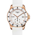 Стальной корпус с PVD-покрытиемPVDУльтратонкое покрытие наносится в технике вакуумного напыления, сочетает в себе нитрид титана особой прочности со слоем золота или оксида хрома. Несёт в себе декоративную или защитную функцию. дополнен керамическим безелемБезельВнешний ободок, закрепляющий стекло. В спортивных часах так называется поворотное кольцо с делениями на циферблате, выполняет роль таймера – замеряет отрезки времени на шкале. Неподвижный безель – элемент декора. Однонаправленно вращающийся безель на дайверских часах позволяет фиксировать моменты погружения и выныривания на поверхность., устойчивым к царапинам. Секундный счётчик вынесен в нижнюю часть циферблата. Каучуковый ремешок отличается мягкостью и прочностью. В основе работы – швейцарский кварцевый механизм ETA G15.211.