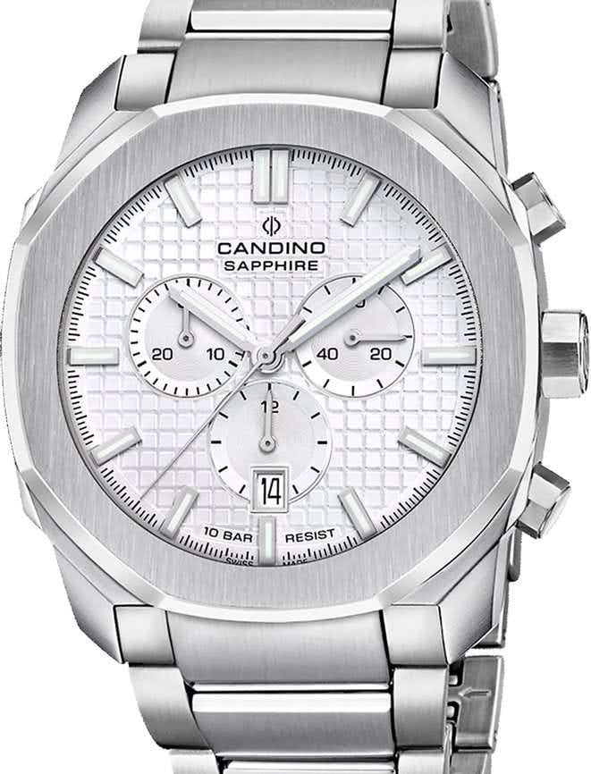 Мужские наручные часы-хронографХронографФункция позволяет измерять отрезки времени с особой точностью: часы, минуты, секунды. Верным признаком хронографа является наличие на циферблате 3 дополнительных окошек-счётчиков. Candino C4746/5 из коллекции Chronos Carree сочетают в себе современный дизайн и надежность швейцарского качества. Модель обладает круглым корпусом, выполненным из высококачественной нержавеющей стали, что обеспечивает устойчивость к коррозии и внешним воздействиям . Для защиты циферблата используется сапфировое стеклоСапфировое стеклоПрочный и надёжный материал из кристалла сапфира синтетического происхождения, характеризующийся особой твёрдостью и устойчивостью к царапинам и повреждениям., известное своей прочностью и устойчивостью к царапинам . Часы оснащены кварцевым механизмом, гарантирующим высокую точность хода без необходимости дополнительного обслуживания . Циферблат украшен узором гильоше, сочетающим геометрические и радиальные элементы, что придает модели элегантный вид. Браслет изготовлен из нержавеющей стали с раскладной застежкойРаскладная застёжкаТакой тип застёжки используется только на браслетах из металла. Она никогда не раскрывается полностью, происходит разделение на 2 и более частей. Раскладывающая застёжка снизит вероятность потери часов к минимуму., обеспечивающей комфортное ношение и безопасность . Модель также оснащена функцией секундомераСекундомерСекундоме́р — прибор, способный измерять интервалы времени с точностью до долей секунды., что делает её идеальной для активного образа жизни . Водонепроницаемость часов составляет 10 атмосфер (100 метров), что позволяет использовать их во время плавания и других водных видов спорта . Часы подходят для повседневной носки, сохраняя стиль и функциональность.