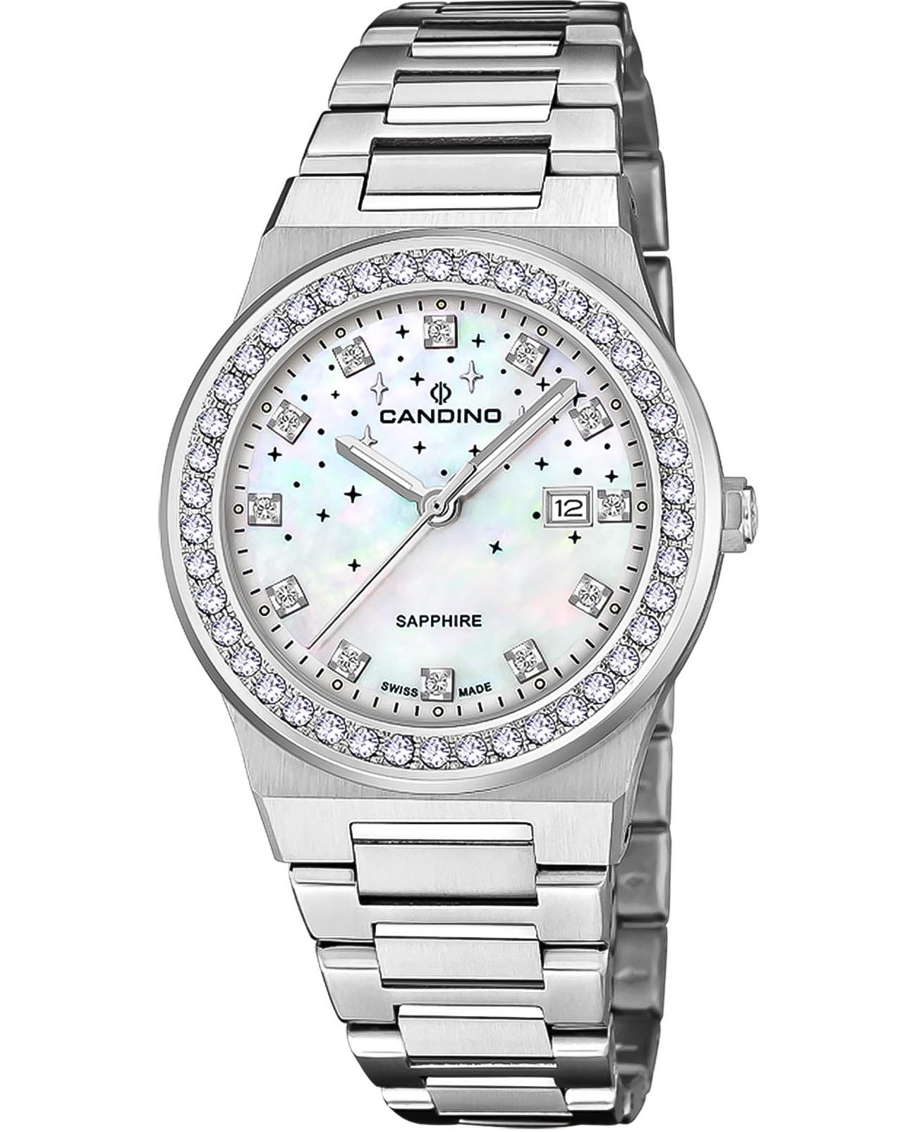 Женские наручные часы Candino Lady Elegance Sparkling Date C4749/1 с надёжным кварцевым механизмом. Корпус и браслет часов изготовлены из нержавеющей стали. Сапфировое стеклоСапфировое стеклоПрочный и надёжный материал из кристалла сапфира синтетического происхождения, характеризующийся особой твёрдостью и устойчивостью к царапинам и повреждениям. повышенной прозрачности, устойчивое к мелким механическим повреждениям. Стальной браслет на раскладной застёжкеРаскладная застёжкаТакой тип застёжки используется только на браслетах из металла. Она никогда не раскрывается полностью, происходит разделение на 2 и более частей. Раскладывающая застёжка снизит вероятность потери часов к минимуму.. Стрелки и метки с люминесцентным покрытиемЛюминесцентное покрытиеПозволяет считывать показания времени в темноте. Производители наносят на стрелки, часовые индексы, безель или поверхность циферблата светонакопительный состав, дающий холодное свечение.. Перламутровый циферблат с россыпью звёзд и безельБезельВнешний ободок, закрепляющий стекло. В спортивных часах так называется поворотное кольцо с делениями на циферблате, выполняет роль таймера – замеряет отрезки времени на шкале. Неподвижный безель – элемент декора. Однонаправленно вращающийся безель на дайверских часах позволяет фиксировать моменты погружения и выныривания на поверхность. инкрустированы цирконами. Класс водозащиты: 50 метров, позволит защитить корпус от случайных брызг или капель дождя. Окошко даты находится в положении 3 часа.