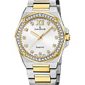 Женские наручные часы Candino Lady Elegance C4752/1 с надёжным кварцевым механизмом. Корпус и браслет часов изготовлены из нержавеющей стали. Сапфировое стеклоСапфировое стеклоПрочный и надёжный материал из кристалла сапфира синтетического происхождения, характеризующийся особой твёрдостью и устойчивостью к царапинам и повреждениям. повышенной прозрачности, устойчивое к мелким механическим повреждениям. Стальной браслет с частичным PVD-покрытиемPVDУльтратонкое покрытие наносится в технике вакуумного напыления, сочетает в себе нитрид титана особой прочности со слоем золота или оксида хрома. Несёт в себе декоративную или защитную функцию. на раскладной застёжкеРаскладная застёжкаТакой тип застёжки используется только на браслетах из металла. Она никогда не раскрывается полностью, происходит разделение на 2 и более частей. Раскладывающая застёжка снизит вероятность потери часов к минимуму.. Стрелки и метки с люминесцентным покрытиемЛюминесцентное покрытиеПозволяет считывать показания времени в темноте. Производители наносят на стрелки, часовые индексы, безель или поверхность циферблата светонакопительный состав, дающий холодное свечение.. Циферблат и безельБезельВнешний ободок, закрепляющий стекло. В спортивных часах так называется поворотное кольцо с делениями на циферблате, выполняет роль таймера – замеряет отрезки времени на шкале. Неподвижный безель – элемент декора. Однонаправленно вращающийся безель на дайверских часах позволяет фиксировать моменты погружения и выныривания на поверхность. инкрустированы цирконами. Класс водозащиты: 50 метров, позволит защитить корпус от случайных брызг или капель дождя.