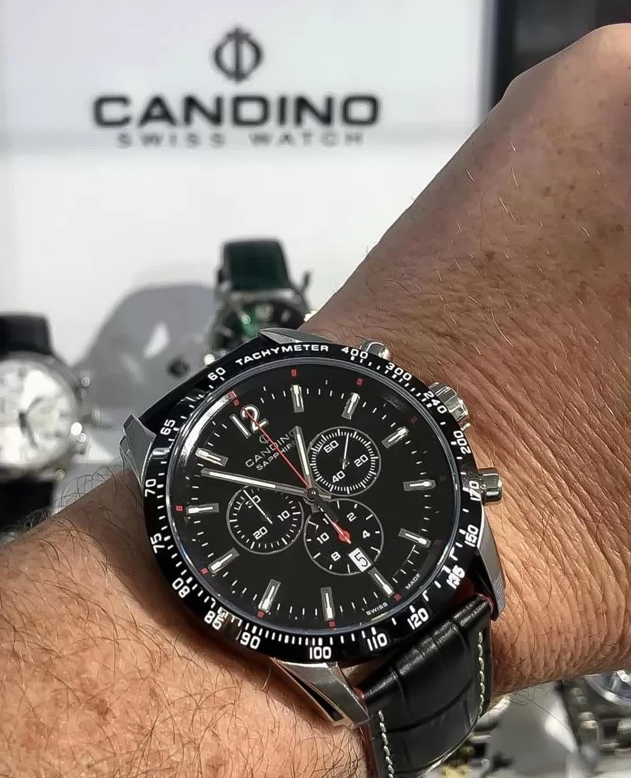Швейцарские мужские наручные часы-хронографХронографФункция позволяет измерять отрезки времени с особой точностью: часы, минуты, секунды. Верным признаком хронографа является наличие на циферблате 3 дополнительных окошек-счётчиков. Candino Gents Sport C4758/4, кварцевый механизм с высокой точностью. Сапфировое стеклоСапфировое стеклоПрочный и надёжный материал из кристалла сапфира синтетического происхождения, характеризующийся особой твёрдостью и устойчивостью к царапинам и повреждениям. устойчивое к появлению царапин, обладающее высокой прозрачностью. Часы, минуты, секунды. Окошко даты находится в положении 6 часов. Класс водозащиты: 100 метров, позволит плавать, нырять и заниматься другими водными видами спорта. Корпус часов изготовлен из нержавеющей стали. Стрелки и метки с люминесцентным покрытиемЛюминесцентное покрытиеПозволяет считывать показания времени в темноте. Производители наносят на стрелки, часовые индексы, безель или поверхность циферблата светонакопительный состав, дающий холодное свечение.. Кожаный ремешок на стандартной застёжке. БезельБезельВнешний ободок, закрепляющий стекло. В спортивных часах так называется поворотное кольцо с делениями на циферблате, выполняет роль таймера – замеряет отрезки времени на шкале. Неподвижный безель – элемент декора. Однонаправленно вращающийся безель на дайверских часах позволяет фиксировать моменты погружения и выныривания на поверхность. с PVD-покрытиемPVDУльтратонкое покрытие наносится в технике вакуумного напыления, сочетает в себе нитрид титана особой прочности со слоем золота или оксида хрома. Несёт в себе декоративную или защитную функцию. со шкалой тахиметраТахиметрРазмеченная шкала, располагается на ободке или безеле часов. Тахиметр позволяет рассчитать скорость на определённом участке пути, расстояние измеряется в километрах или милях..
