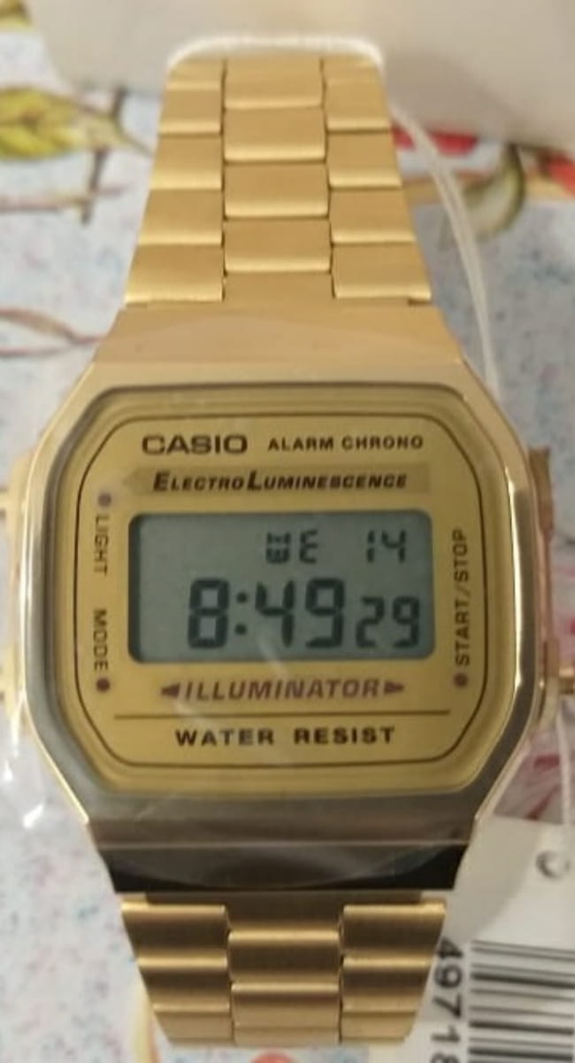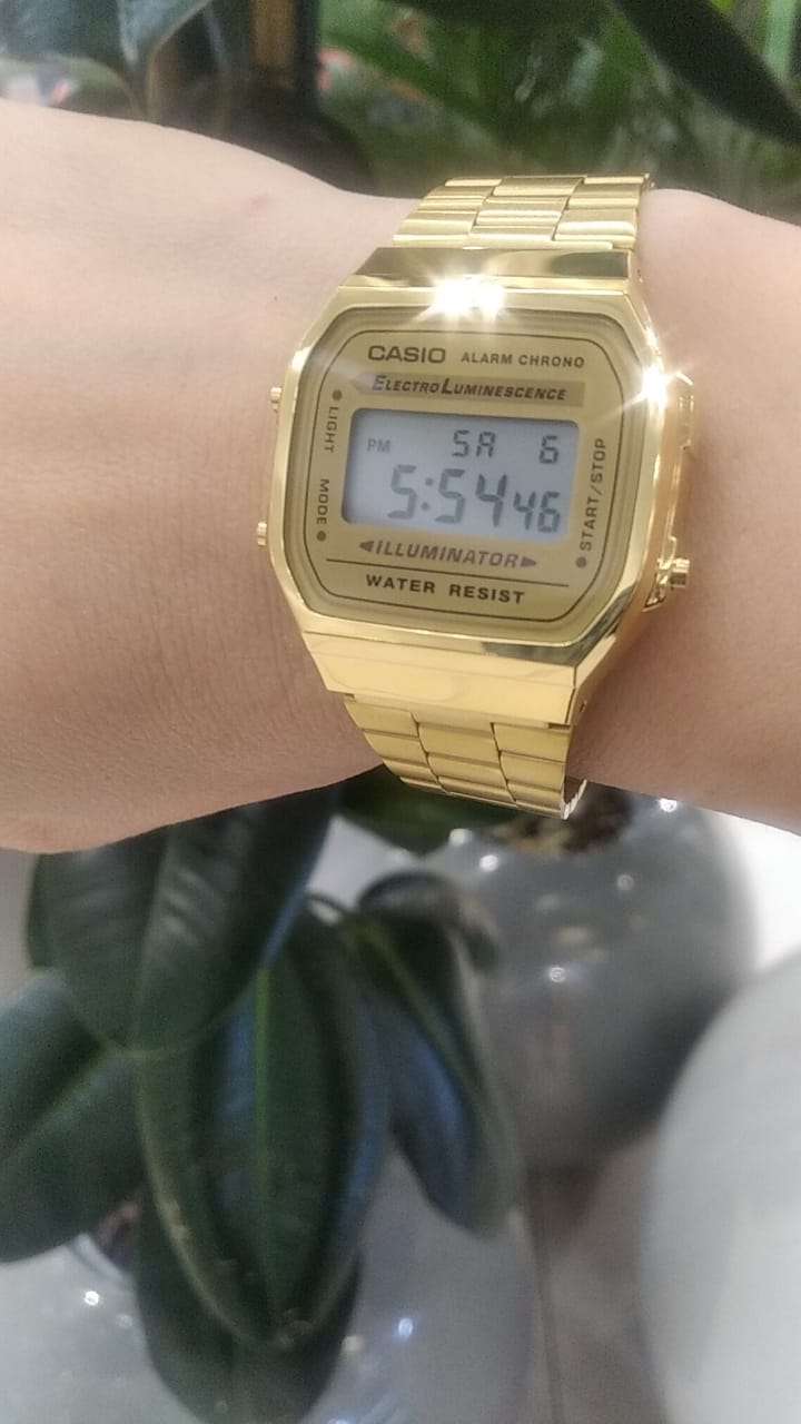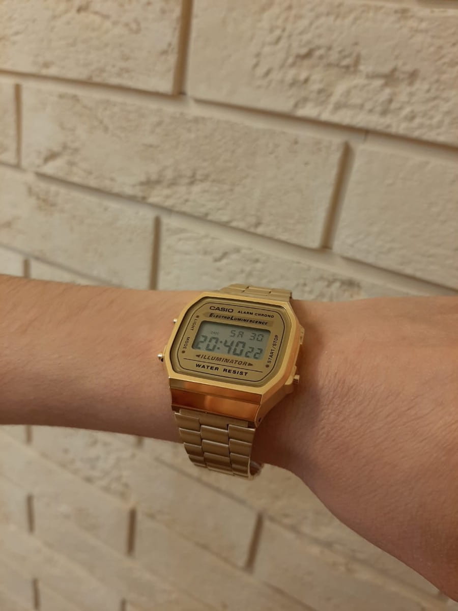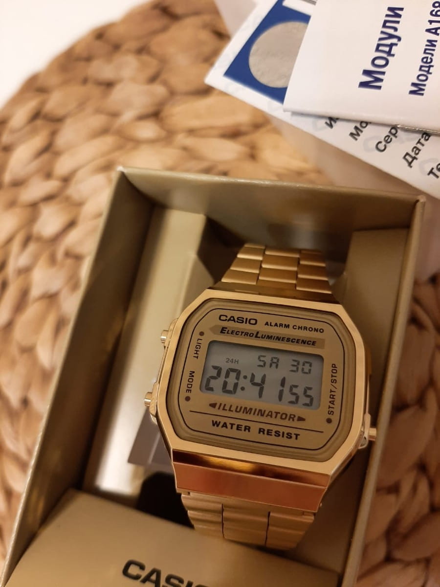 Брендовый аксессуар в золотом цвете имеет IP-покрытиеIP-покрытиеМетод ионного напыления. Демонстрирует повышенную устойчивость к истиранию, окислению и химическим веществам. Под воздействием высокого давления и температуры около 1500°C молекулы металла надёжно соединяются с частицами корпуса часов. стального браслета, защищающее от царапин и изнашивания, а также выполняющее декоративное предназначение. Высокоточный кварцевый механизм. Яркая электролюминесцентная подсветка. Противоударный корпусУдаропрочный корпусМеханизм заключён в корпус, выполненный из современных материалов, устойчивых к ударам, механическим повреждениям и падению с высоты: инновационный пластик, карбон, нержавеющая сталь, титан. 8-угольной формы из надёжного пластика. Удобная застёжка расстёгивается одним касанием. Будильник, автоматический календарь. Габариты: 36,3 x 38,6 x 9,6 мм.