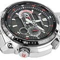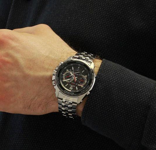 Светодиодная подсветка с автоподсветкой обеспечивает освещение всего циферблата, функция автоподсветки обеспечивает автоматическое включение подсветки. Питание от солнечной энергии, индикатор заряда батареи. Секундомер с точностью показаний 1/100с и временем измерения 24ч. Сплит-хронограф. Таймер обратного отсчета от 1мин до 60мин с автоповтором. Коррекция текущего времени радиосигналом на территории почти всей Европы, Китая, США и Японии. 12-ти и 24-х часовой формат времени. Мировое время. Водонепроницаемость 100м. Минеральное стекло устойчиво к царапинам. Корпус и браслет из нержавеющей стали.