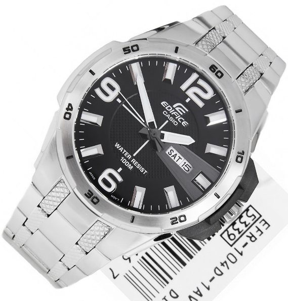 Мужские классические наручные часы Casio Edifice надежные и практичные. Кварцевый японский механизм Miyota. Часы оснащены календарем. Циферблат черного цвета с контрастными индексами и стрелками. Стрелки и индексы с светонакопительным нанесением. Корпус и браслет выполнены из высококачественной стали с антикоррозийными свойствами. Минеральное стекло устойчиво к появлению царапин. Водонепроницаемость (10 Бар). Идеально подходит для  плавания с маской и трубкой.