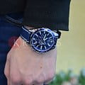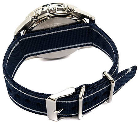 Спортивная модель является воплощением автогоночного дизайна, насыщенно-синий оттенок позволяет сделать часы ключевой деталью образа. Главной особенностью стал комфортный текстильный ремешок, материал не вызывает аллергии на чувствительной коже. Ударопрочный корпусУдаропрочный корпусМеханизм заключён в корпус, выполненный из современных материалов, устойчивых к ударам, механическим повреждениям и падению с высоты: инновационный пластик, карбон, нержавеющая сталь, титан. изготовлен из нержавеющей стали 316L, материал устойчив к царапинам и ударам. Японский кварцевый механизм работает от батарейки, срок службы которой рассчитан на 3 года. Синий алюминиевый безельБезельВнешний ободок, закрепляющий стекло. В спортивных часах так называется поворотное кольцо с делениями на циферблате, выполняет роль таймера – замеряет отрезки времени на шкале. Неподвижный безель – элемент декора. Однонаправленно вращающийся безель на дайверских часах позволяет фиксировать моменты погружения и выныривания на поверхность.. Закаленное минеральное стекло. Люминесцентная подсветка NeobriteПодсветка NeobriteИспользование светонакопительных составов на основе сульфида цинка или алюмината стронция, яркий свет можно наблюдать на протяжении 6-10 часов после «зарядки» часов около источника света.. Водонепроницаемость 10 бар. Заводная головка с системой защиты. Секундомер, календарь, хронографХронографФункция позволяет измерять отрезки времени с особой точностью: часы, минуты, секунды. Верным признаком хронографа является наличие на циферблате 3 дополнительных окошек-счётчиков.. Габариты: 47 x 53 x 11,8 мм.