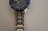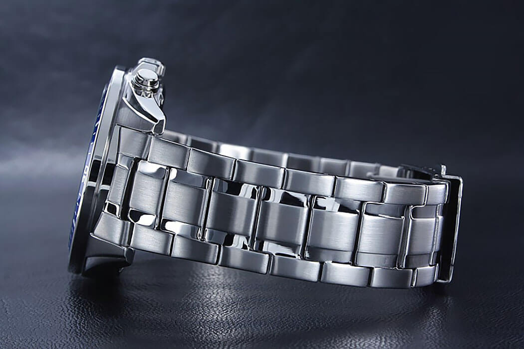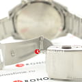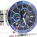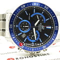 Аксессуар с чёрным циферблатом имеет синие элементы дизайна, общее оформление навеяно автомобильной тематикой. Секундная стрелка с красным наконечником улучшает читаемость показателей. Надёжные часы с закручивающейся задней крышкой оснащены кварцевым механизмом с точностью хода +/- 30 секунд в месяц. Корпус и браслет из хирургической стали 316L. БезельБезельВнешний ободок, закрепляющий стекло. В спортивных часах так называется поворотное кольцо с делениями на циферблате, выполняет роль таймера – замеряет отрезки времени на шкале. Неподвижный безель – элемент декора. Однонаправленно вращающийся безель на дайверских часах позволяет фиксировать моменты погружения и выныривания на поверхность. с синим IP-покрытиемIP-покрытиеМетод ионного напыления. Демонстрирует повышенную устойчивость к истиранию, окислению и химическим веществам. Под воздействием высокого давления и температуры около 1500°C молекулы металла надёжно соединяются с частицами корпуса часов.. Водостойкость до 10 бар. Люминесцентная подсветкаЛюминесцентное покрытиеПозволяет считывать показания времени в темноте. Производители наносят на стрелки, часовые индексы, безель или поверхность циферблата светонакопительный состав, дающий холодное свечение. Neobrite. ХронографХронографФункция позволяет измерять отрезки времени с особой точностью: часы, минуты, секунды. Верным признаком хронографа является наличие на циферблате 3 дополнительных окошек-счётчиков., секундомер, апертура даты. Габариты: 53 x 47 x 12,3 мм.