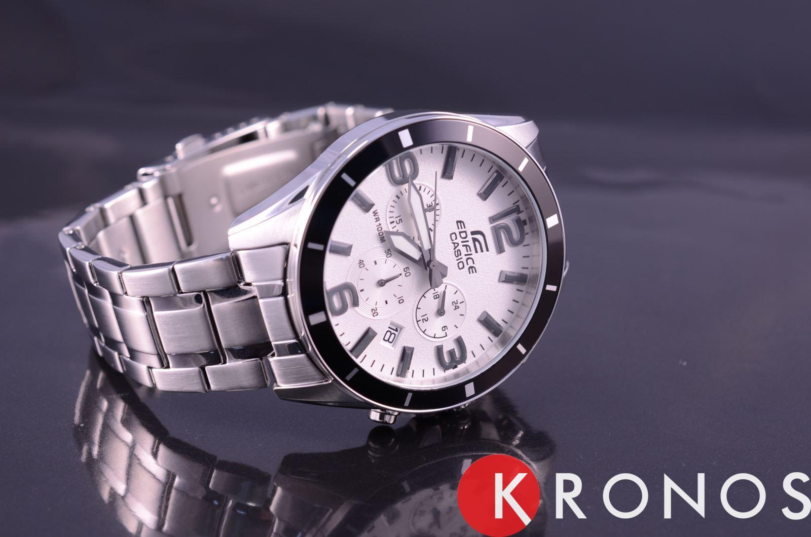 Стильный, мужские наручные часы Casio Edifice надежные и практичные. Кварцевый японский механизм Miyota. Точность хода не хуже -10 +15 сек./в месяц. Часы оснащены функцией хронографа, с точностью 1/10с и временем измерения 1ч. Циферблат белого цвета с контрастными элементами дизайна.  Стрелки и индексы с светонакопительным нанесением. Корпус и браслет выполнены из нержавеющей стали. Безель с IP покрытием черного цвета. Минеральное стекло устойчиво к появлению царапин. Водонепроницаемость 100М. В часах можно плавать. Степень водонепроницаемости не является величиной, эквивалентной функциональной рабочей глубине.