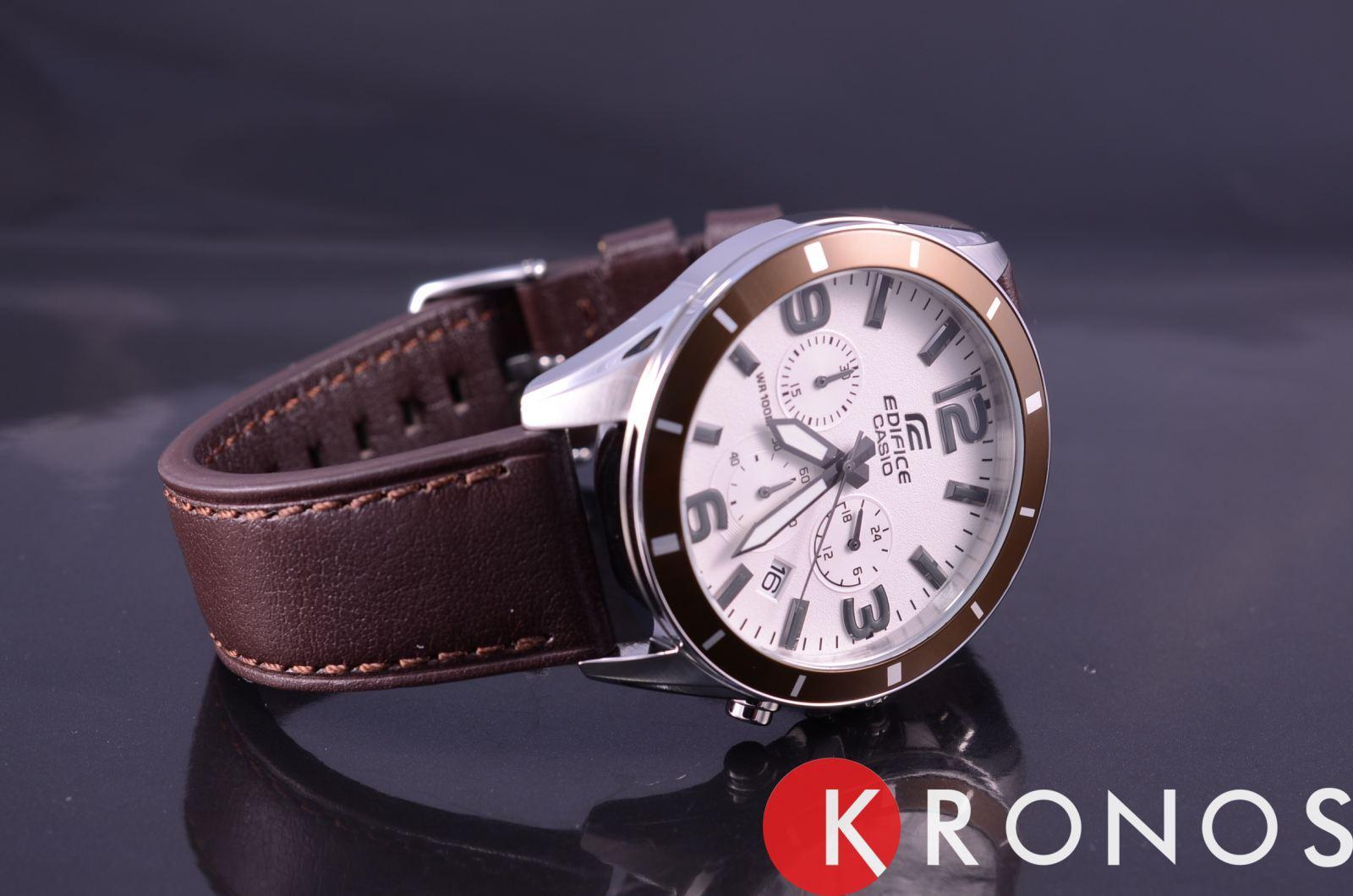 Мужские классические наручные часы Casio Edifice надежные и практичные. Кварцевый японский механизм Miyota. Точность хода не хуже -10 +15 сек./в месяц. Часы оснащены функцией хронографа. Циферблат белого цвета с контрастными индексами. Стрелки и индексы с светонакопительным нанесением. Корпус выполнен из нержавеющей стали. Безель с IP покрытием коричневого цвета. Ремешок из натуральной кожи, коричневого цвета. Минеральное стекло устойчиво к появлению царапин. Водонепроницаемость 100М. В часах можно плавать. Степень водонепроницаемости не является величиной, эквивалентной функциональной рабочей глубине.